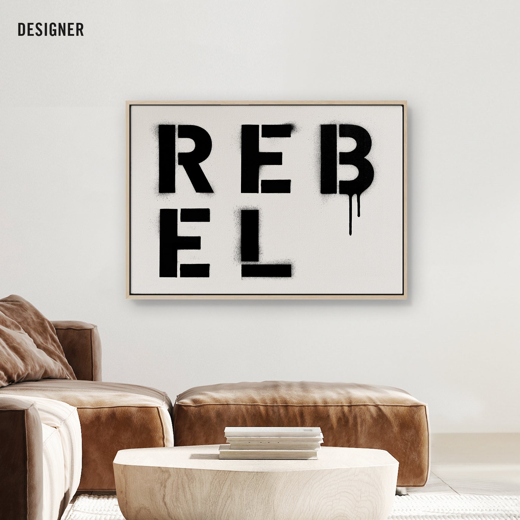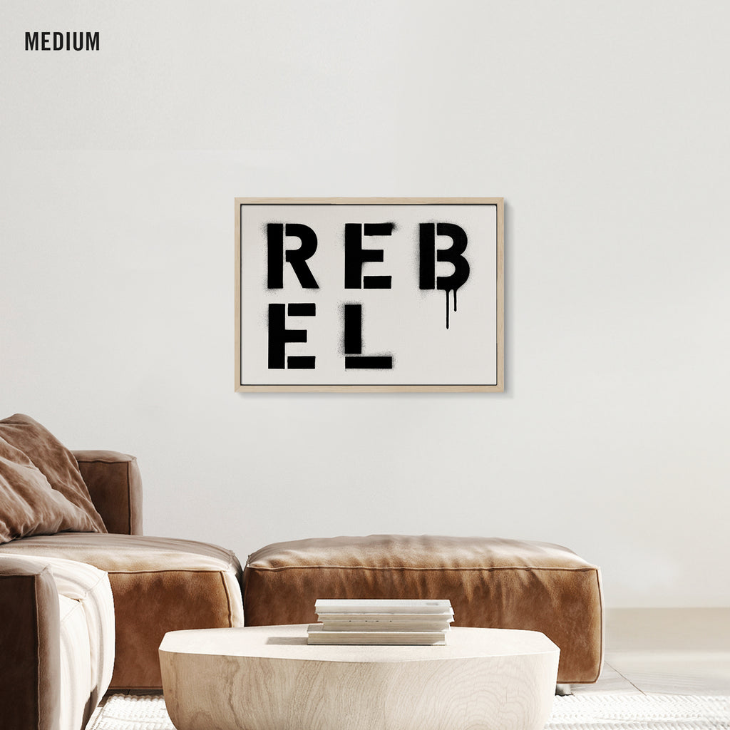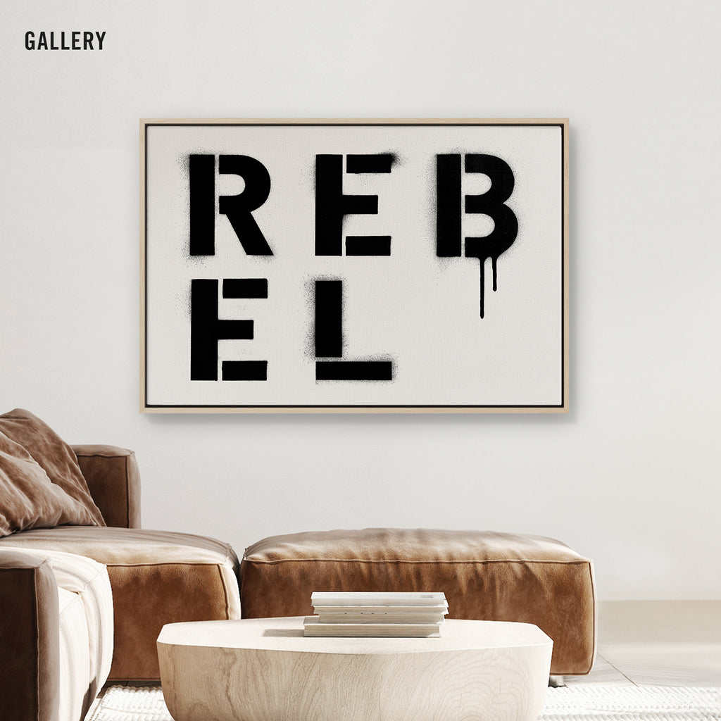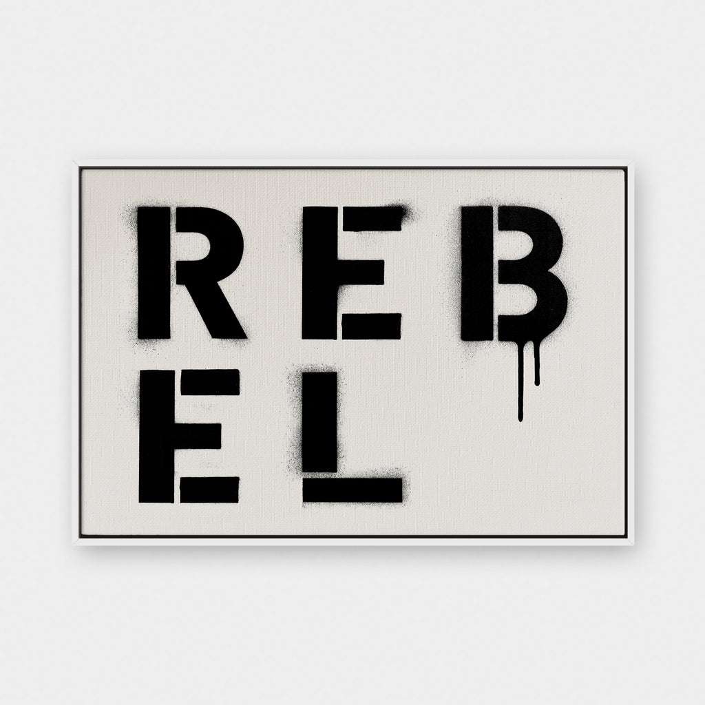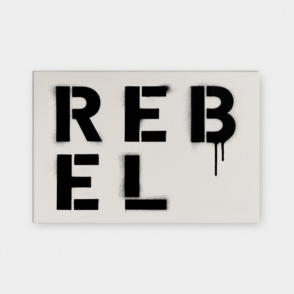 The raw spirit of defiance. REBEL is spray-painted in stark stencil cuts, dripping with grit and energy. It’s a declaration for anyone who refuses to follow the rules.