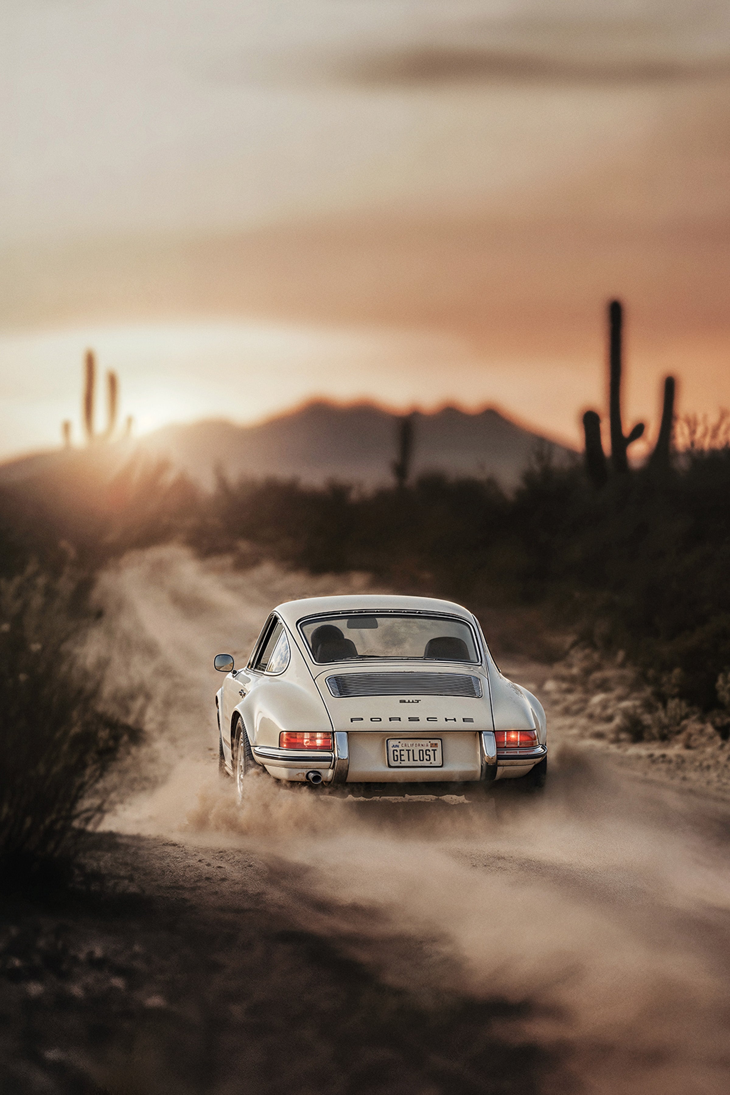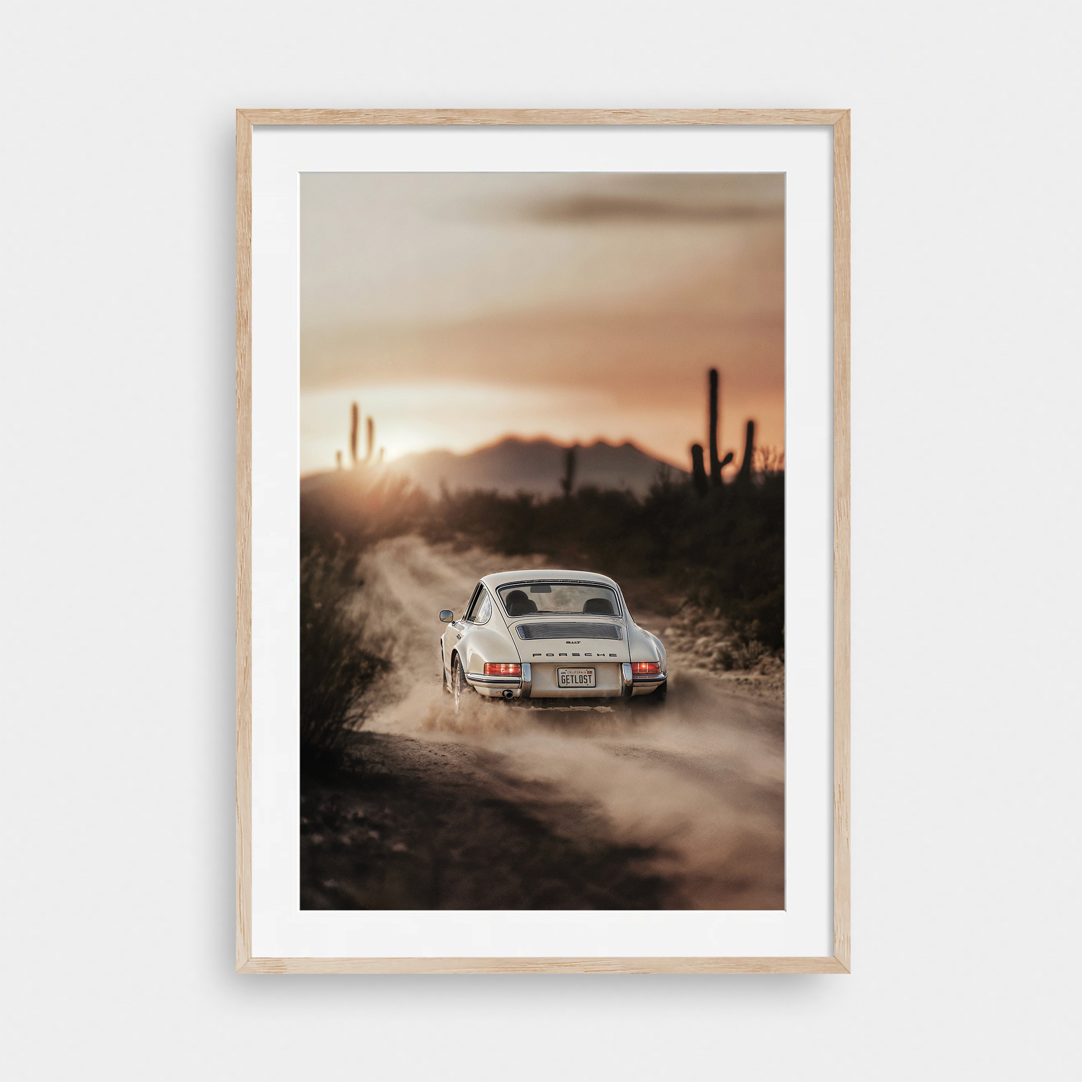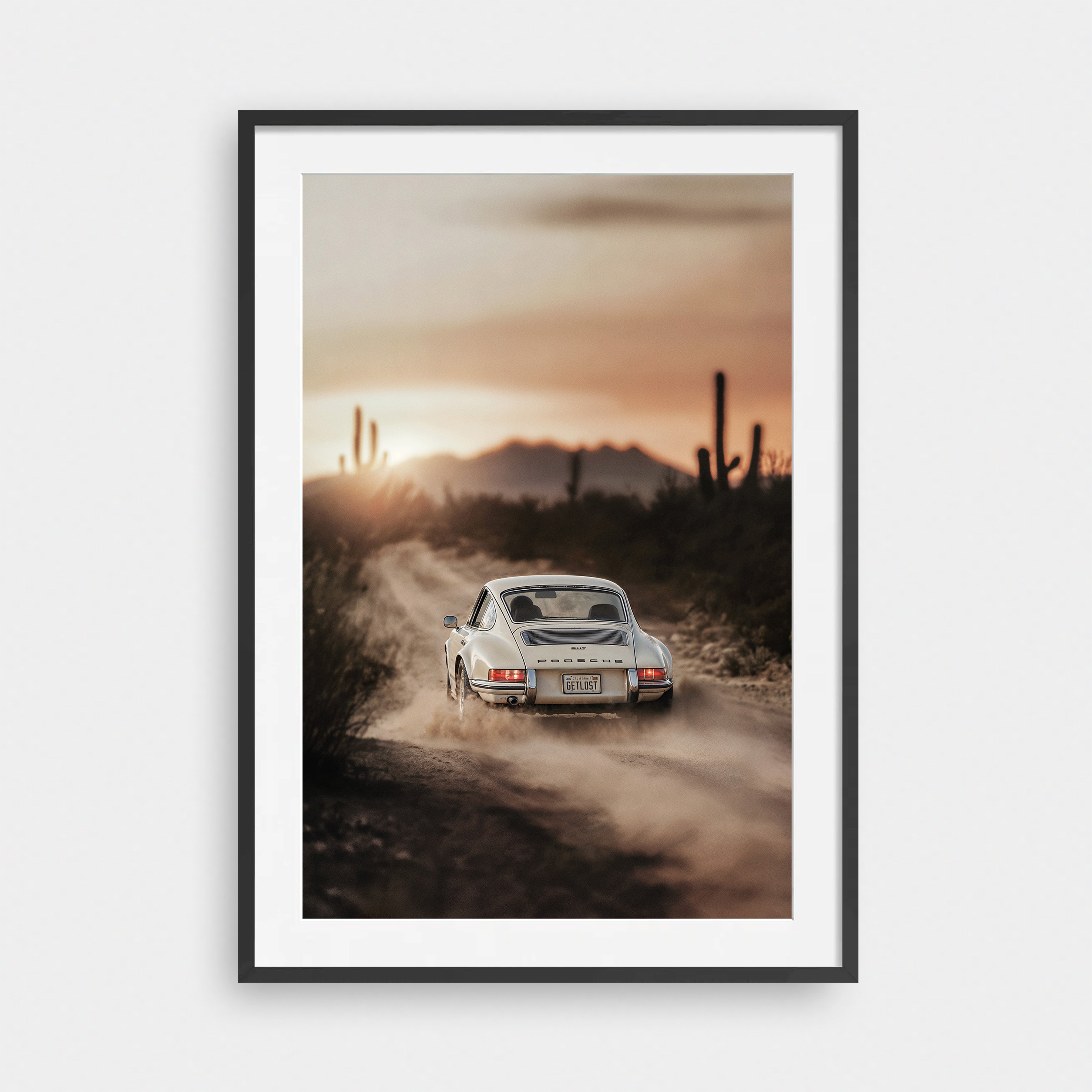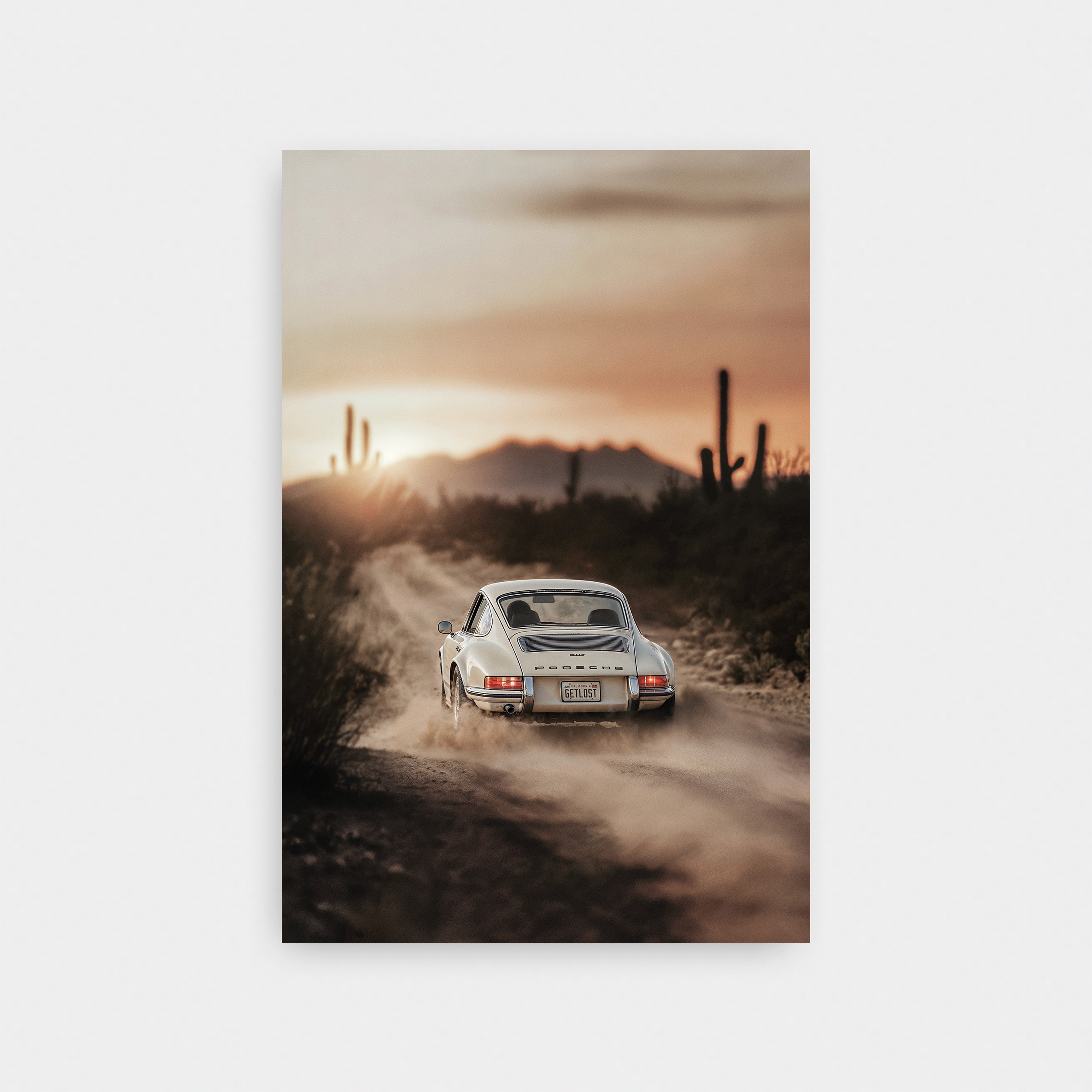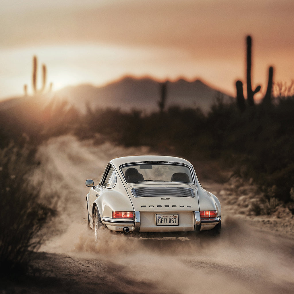 Its driver? Nobody knows for sure. Stories tell of a modern-day outlaw who traded their spurs for spark plugs, their horse for horsepower. Local legends whisper about a ghost driver who only appears when the desert light plays tricks between the saguaros, chasing freedom at 7000 RPM. The roar of that flat-six engine echoes off canyon walls like ancient war cries, while those taillights cut through dust clouds like rubies caught in a sandstorm. In a land where cowboys once ruled, this mechanical mustang writes its own legacy - one desert trail at a time, always moving, forever lost, eternally free against the Arizona twilight.