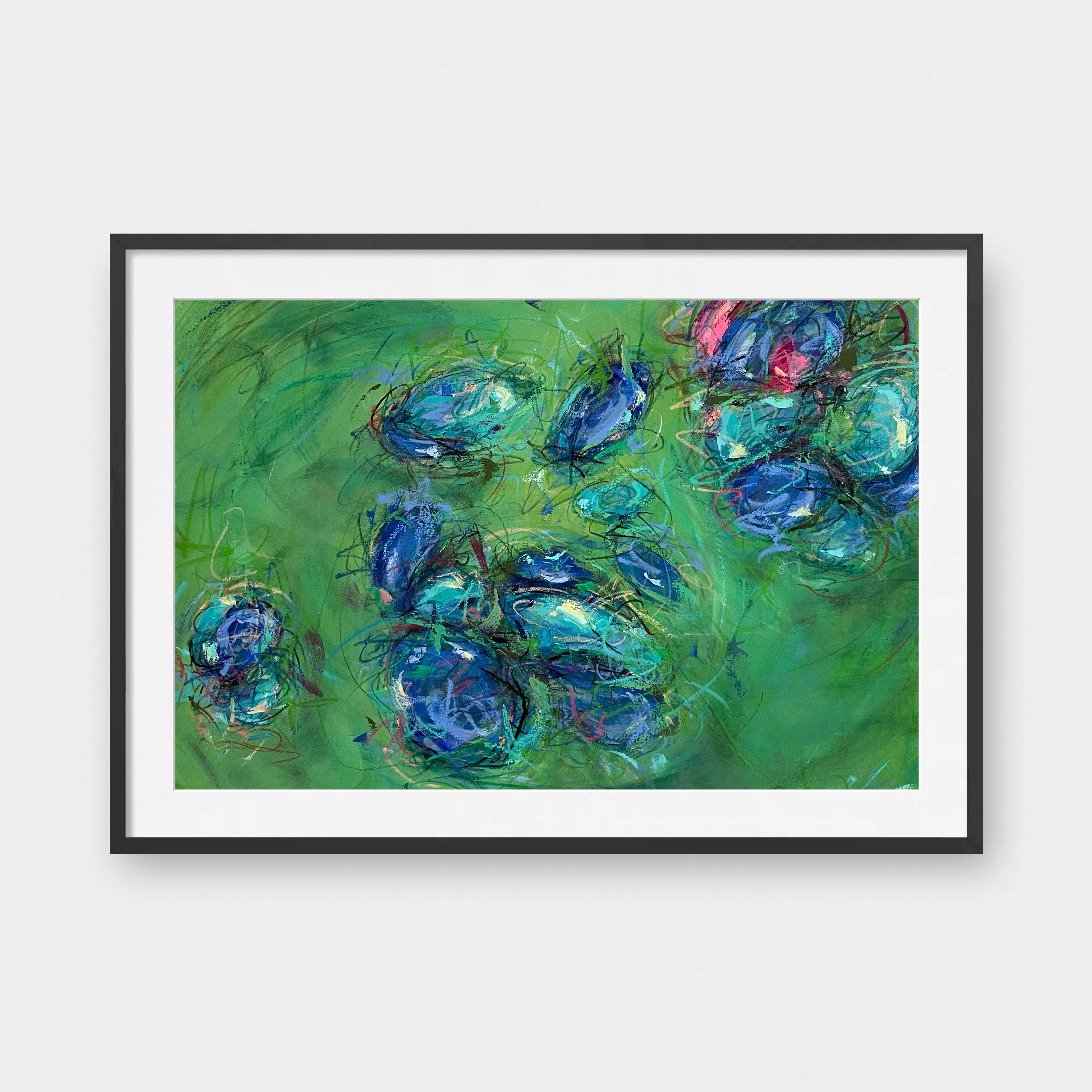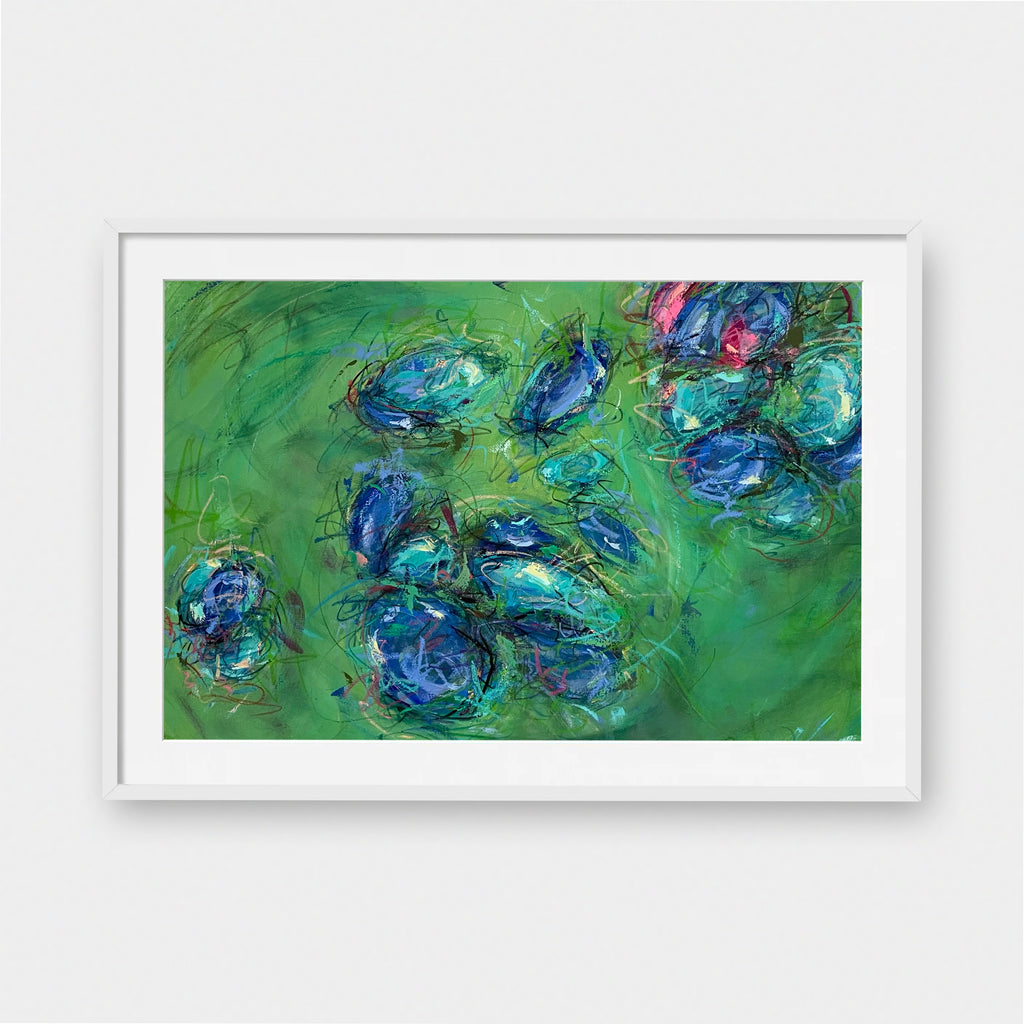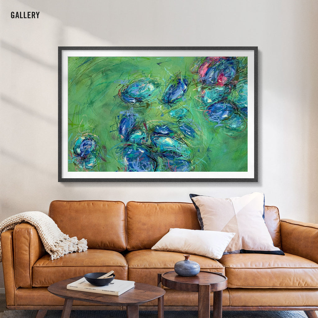 Framed Art Prints feature a contemporary high quality solid wood frame. Pieces come ready to hang with a wire hanger and paper backing. Framed with a white, 2" matte border.