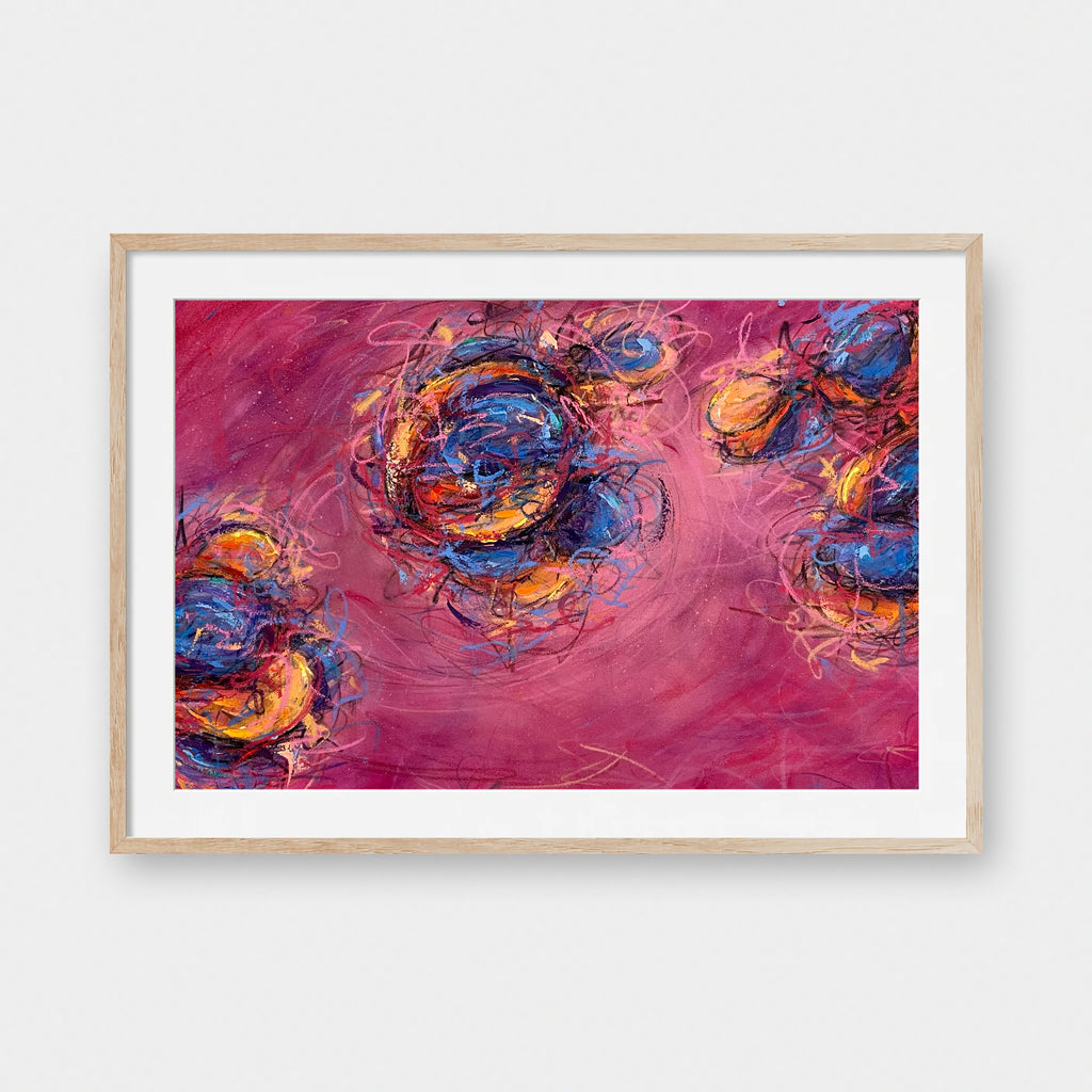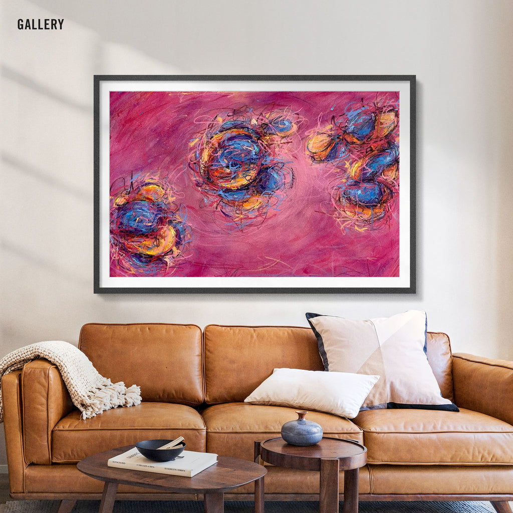 Framed Art Prints feature a contemporary high quality solid wood frame. Pieces come ready to hang with a wire hanger and paper backing. Framed with a white, 2" matte border.