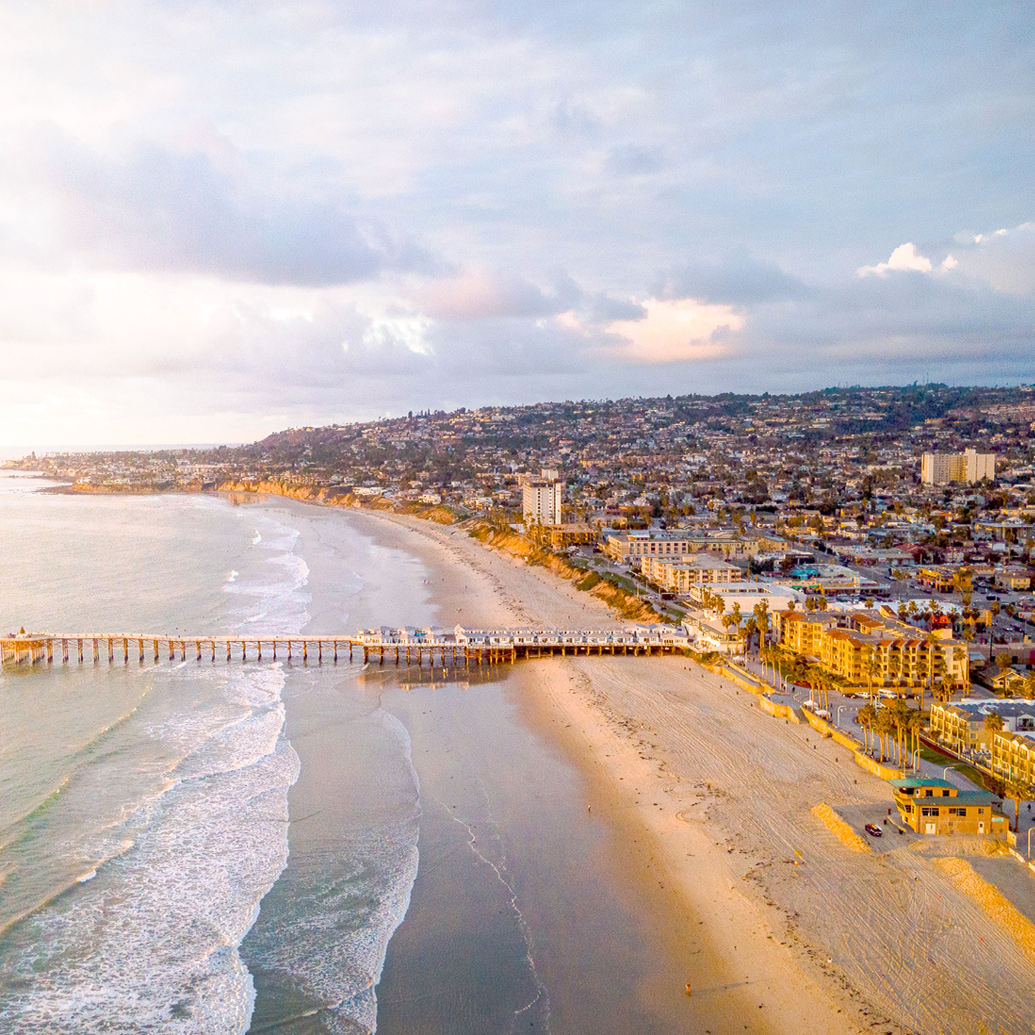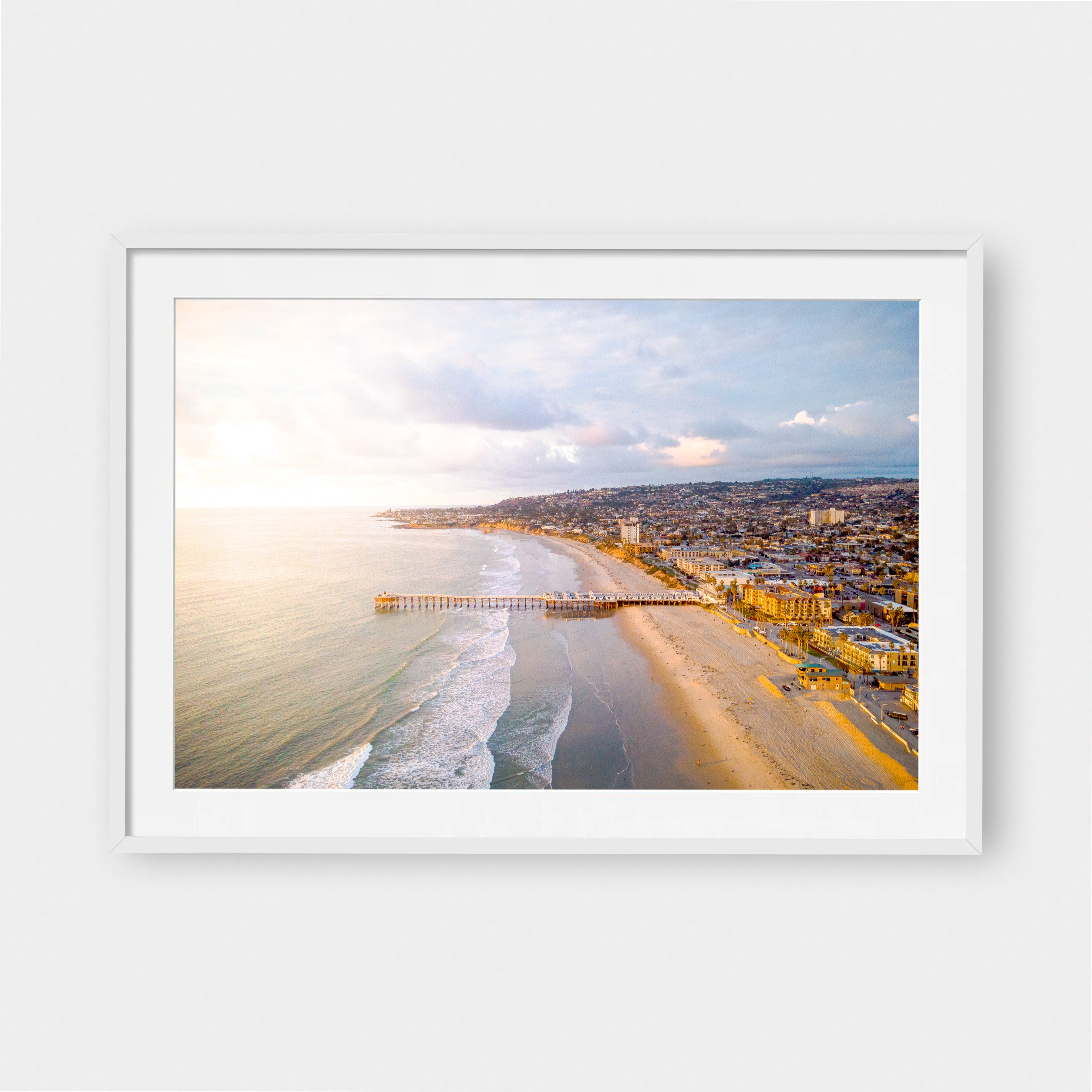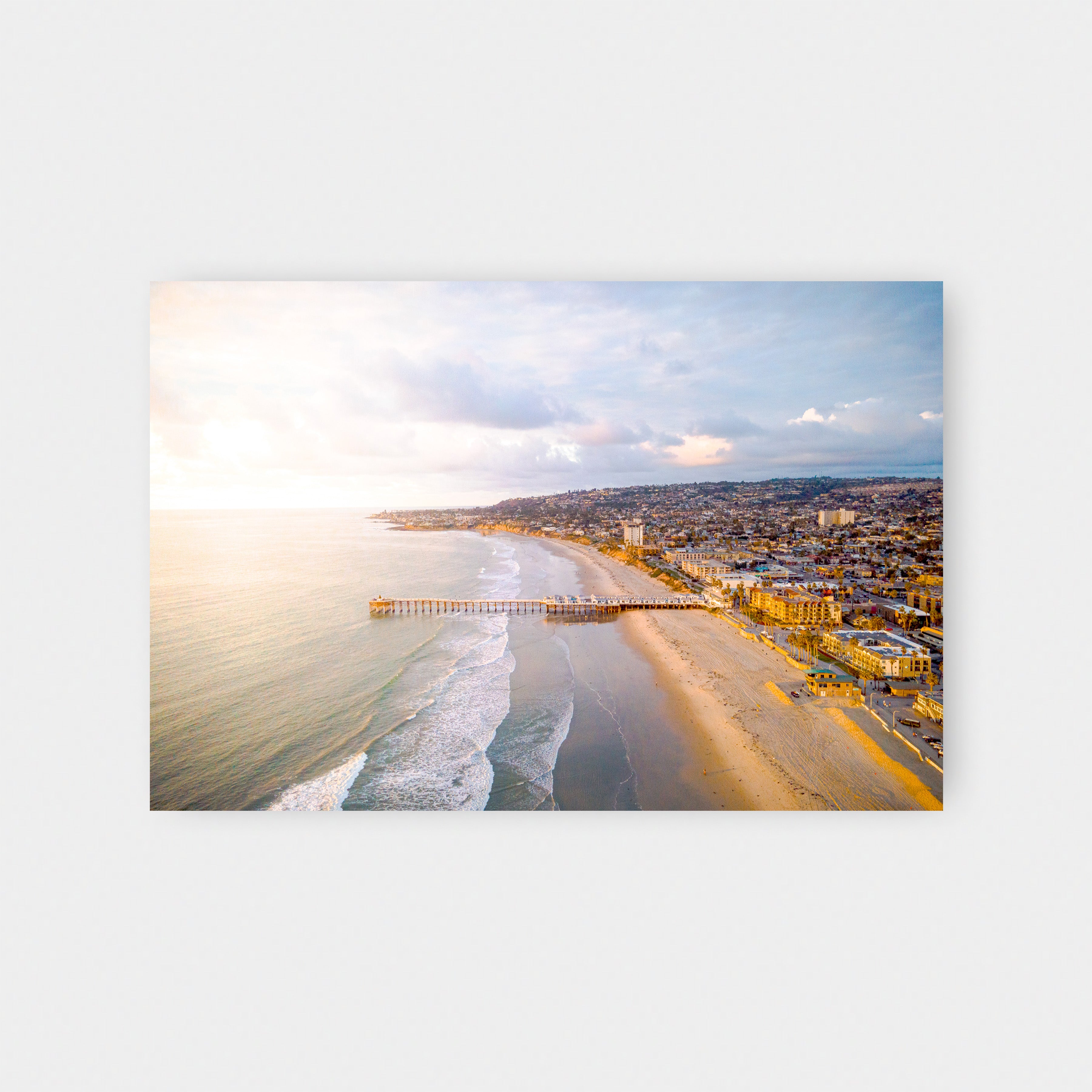 Bathed in soft coastal light, Crystal Pier captures a quiet, cinematic moment along the Southern California shoreline. The pier stretches confidently into the Pacific, a simple, timeless line dividing land and sea, while the city rises gently behind it—layered, lived-in, and glowing with warmth. Pastel skies, rolling waves, and sun-washed sand create a calm contrast between structure and nature, movement and stillness.