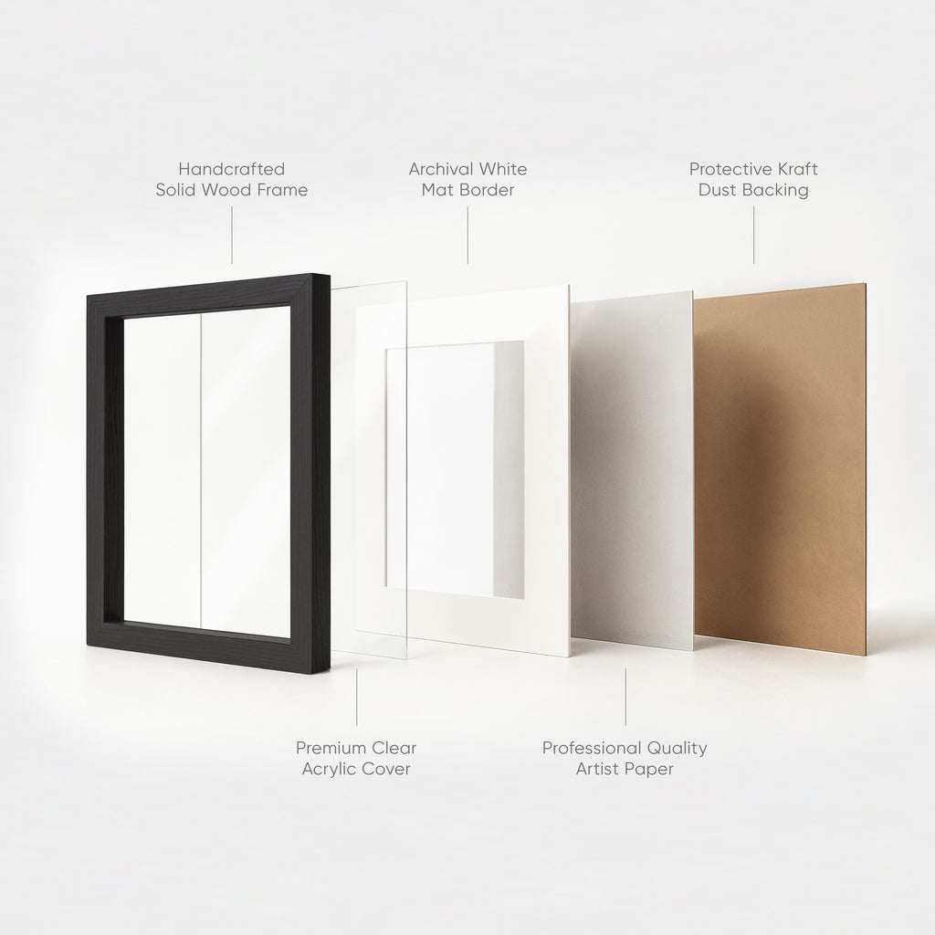 Our frames are meticulously crafted from the highest quality solid wood, exuding a modern yet timeless appeal. The matboard boasts a premium 4-ply white composition, beveled at a 45-degree angle. To ensure utmost quality, each frame is finished to perfection and includes a premium thick kraft paper dust cover along with an included hanging wire for effortless display.