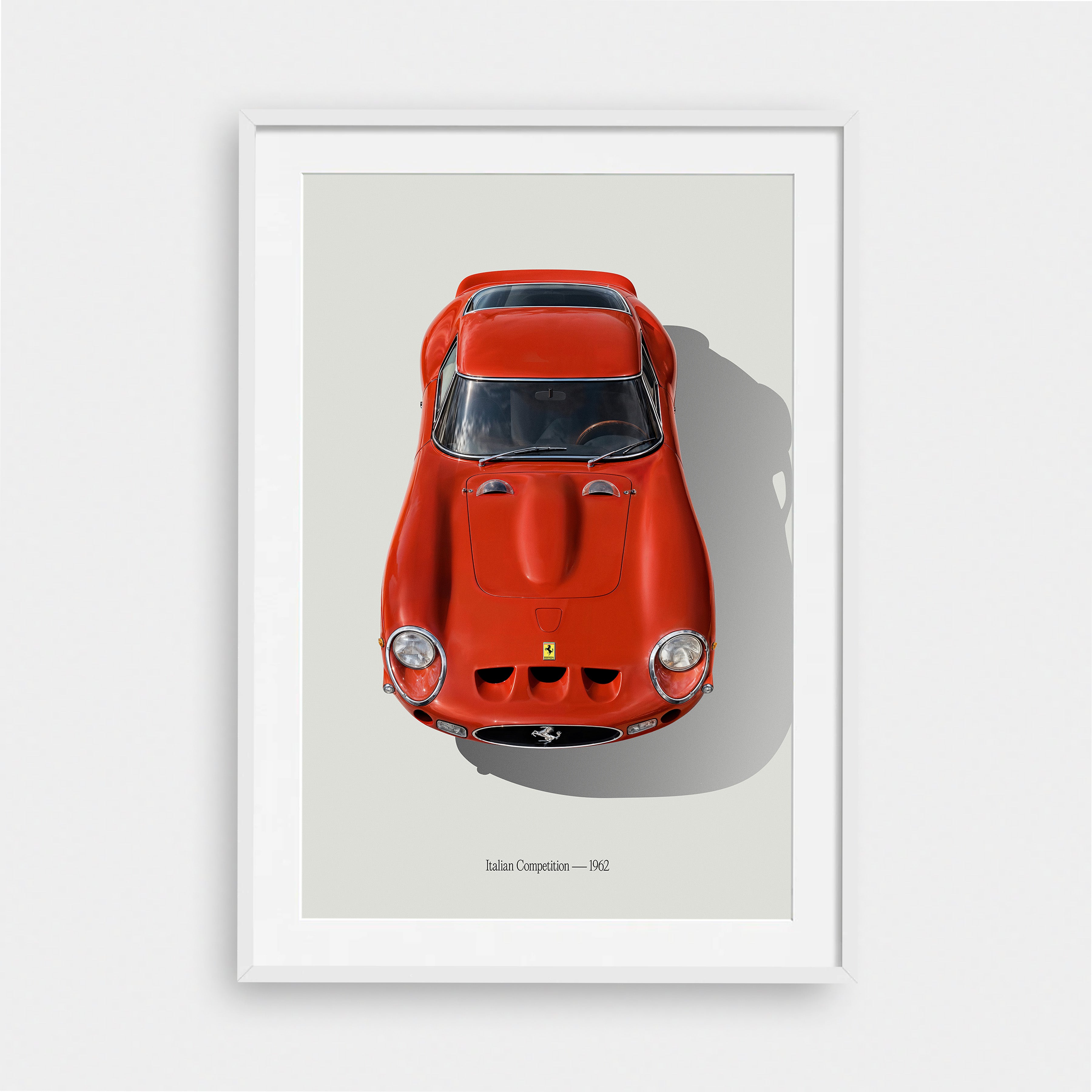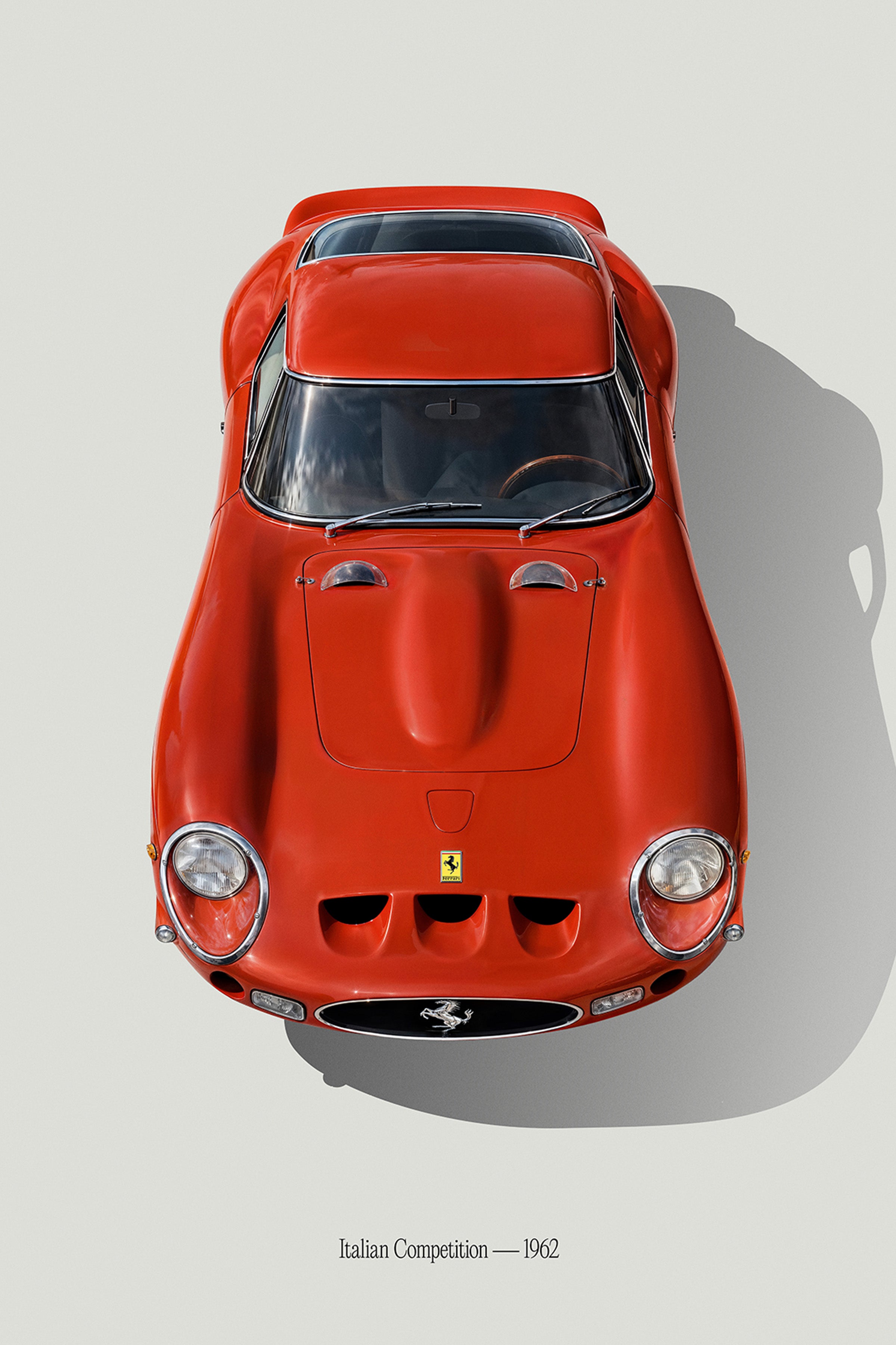 Italian Competition — 1962 is part of the Lndn Gray Car Series — a gallery-level tribute to motorsport icons captured through clean minimal design. From above, this machine becomes what it always was: a sculpted red missile engineered for glory.