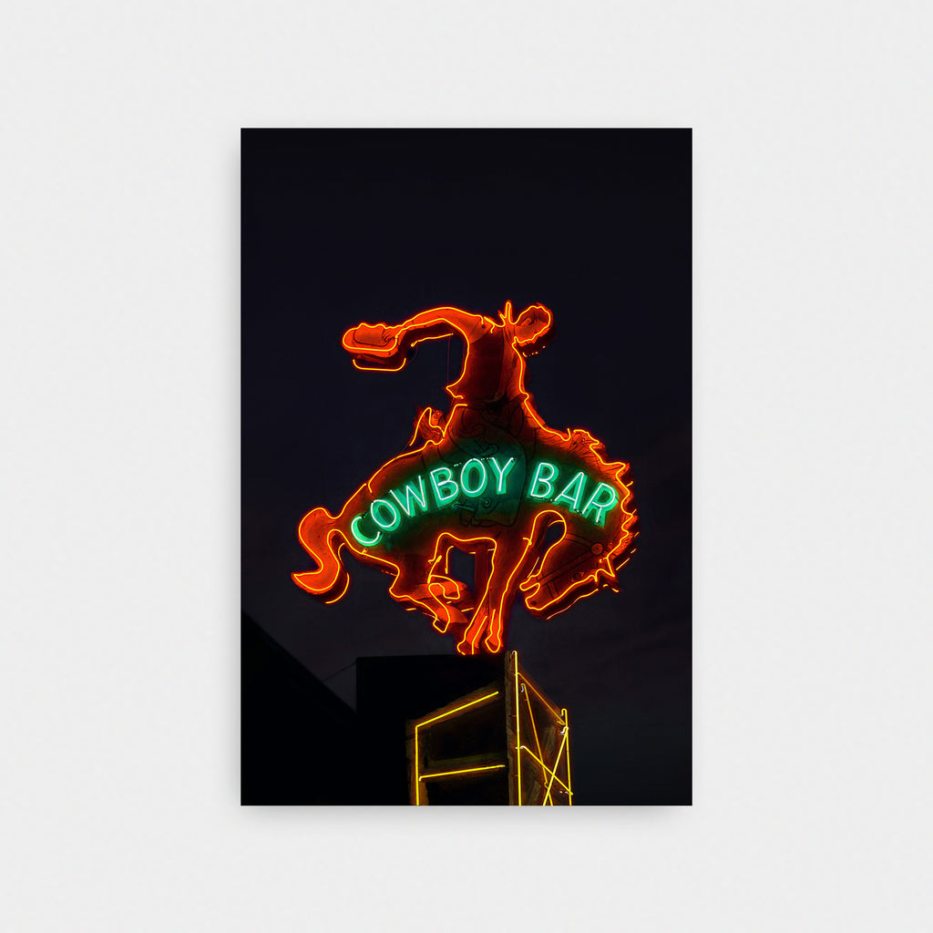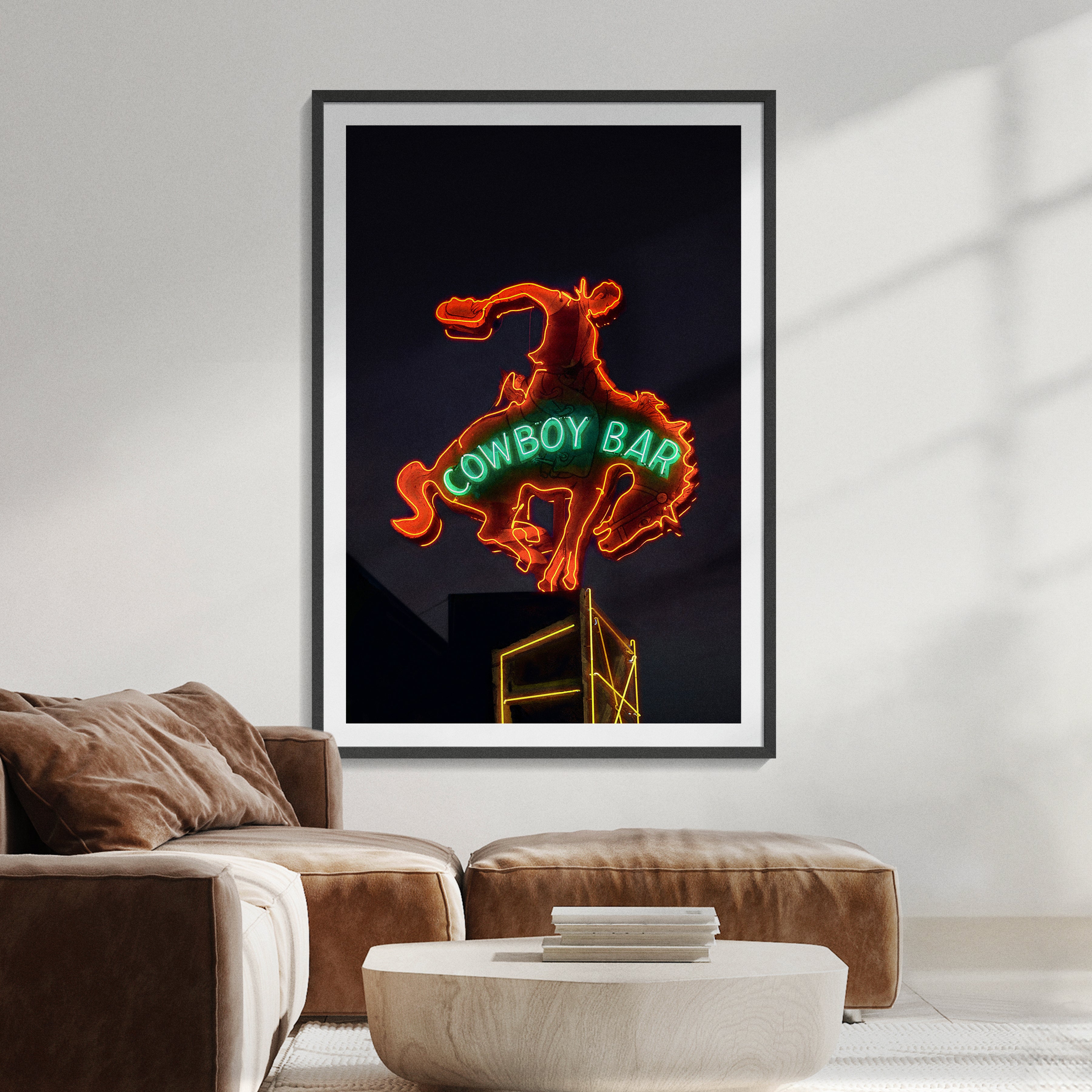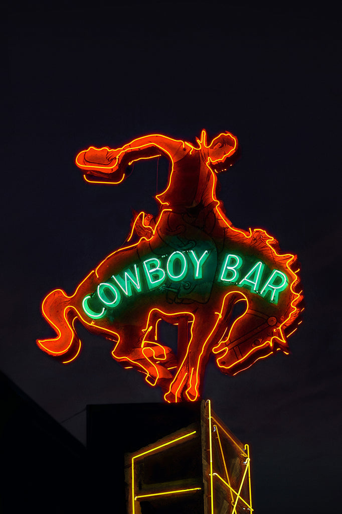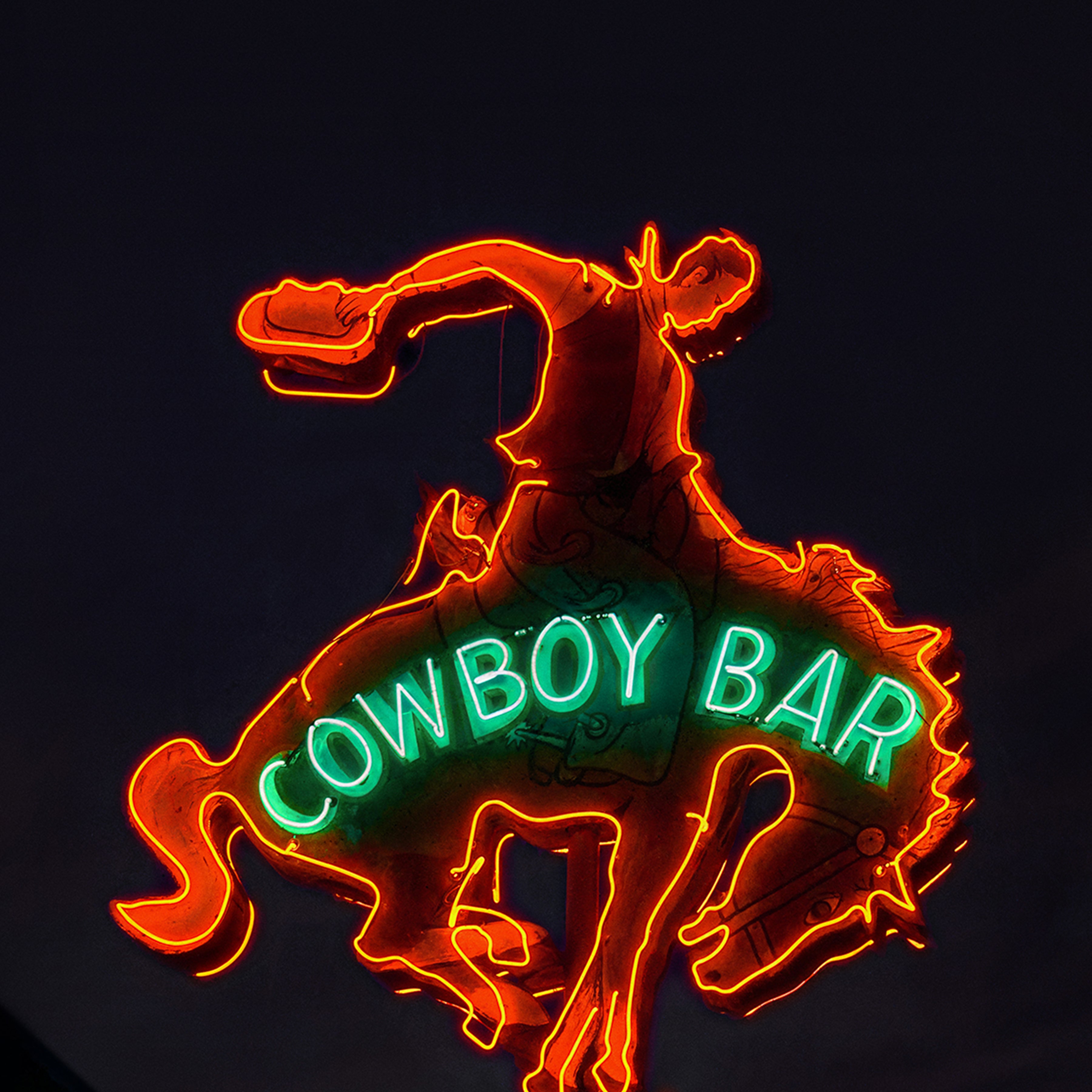 A glowing slice of Western Americana captured against the night sky — the iconic Million Dollar Cowboy Bar sign in Jackson Hole, Wyoming. The vivid red neon outlines a bronc rider mid-buck, while electric green letters spell out COWBOY BAR across the horse’s side. The sign radiates warmth and grit, its vintage glow evoking decades of saloon stories, live country music, and the rugged charm of the old West brought to life on the town square.