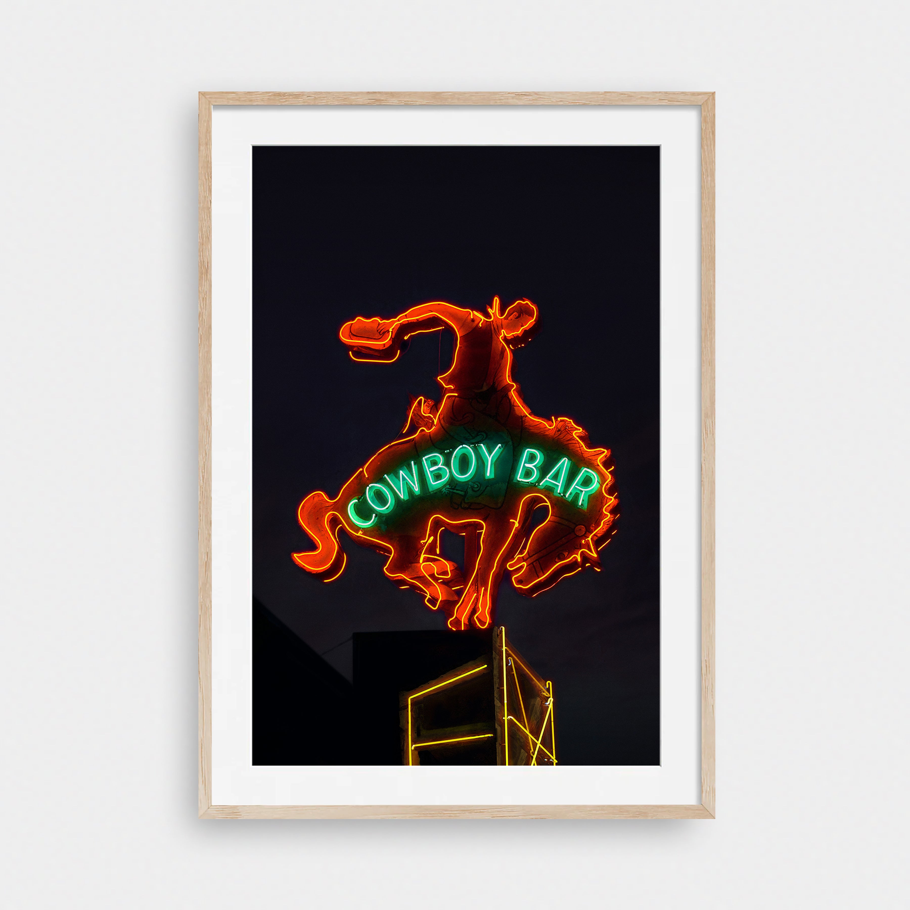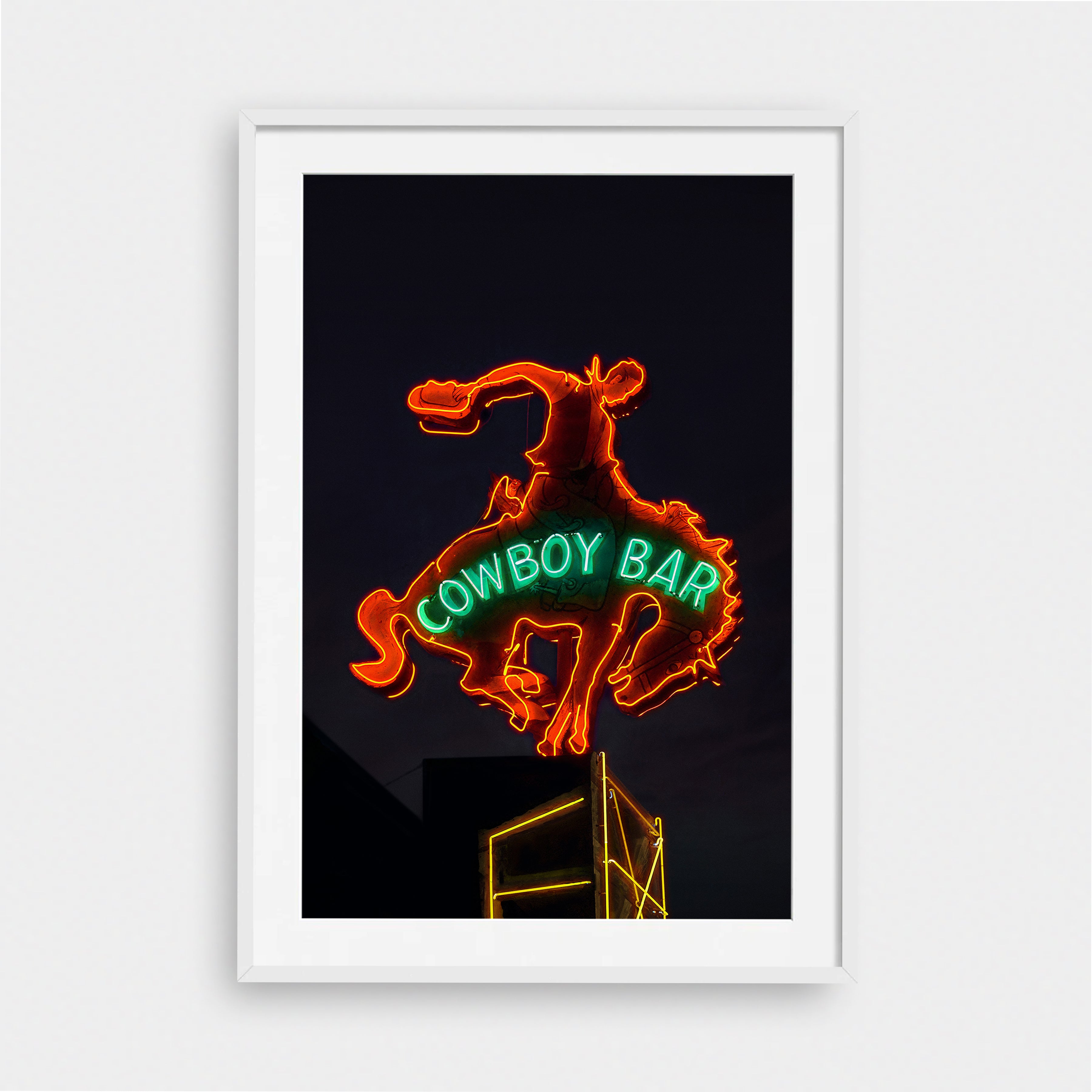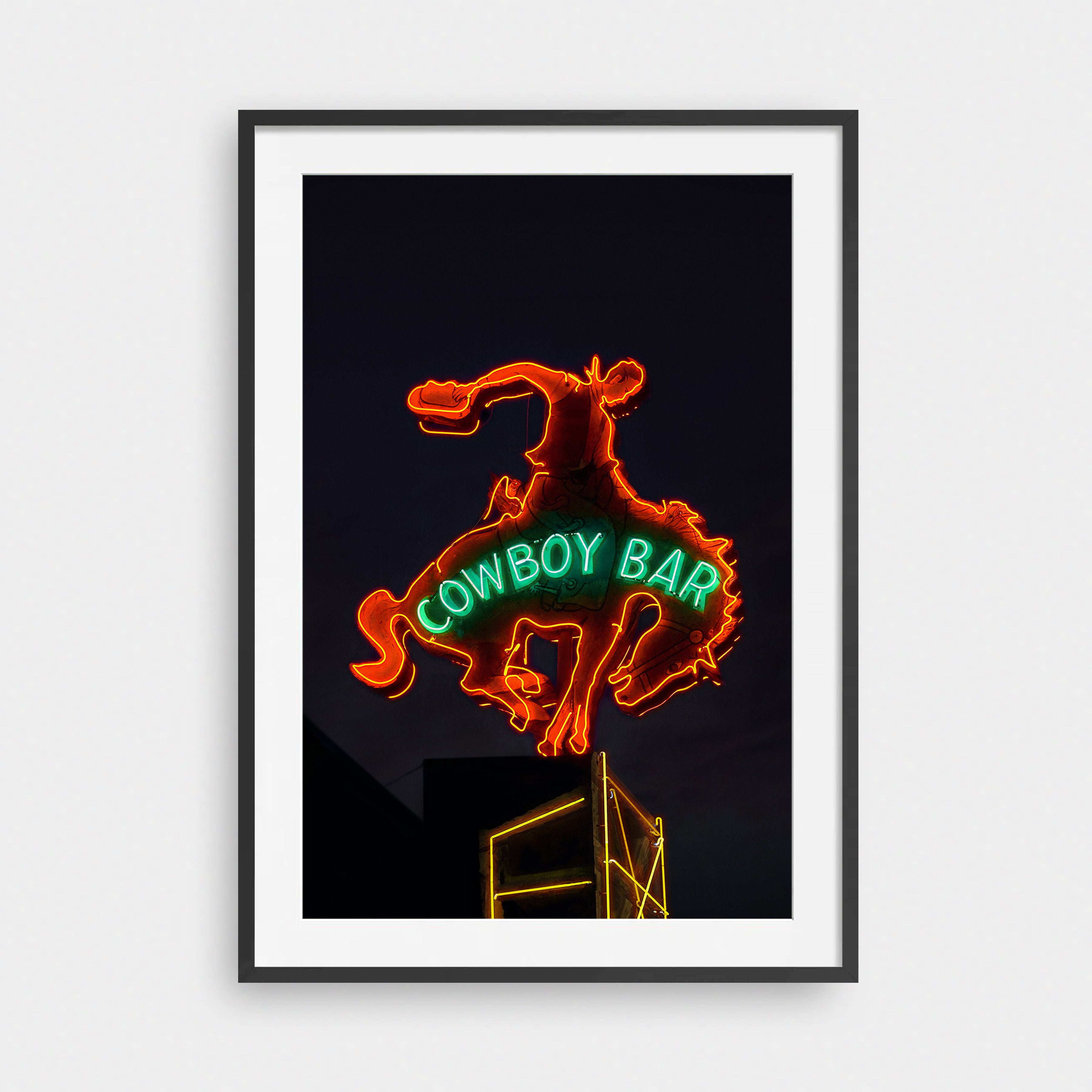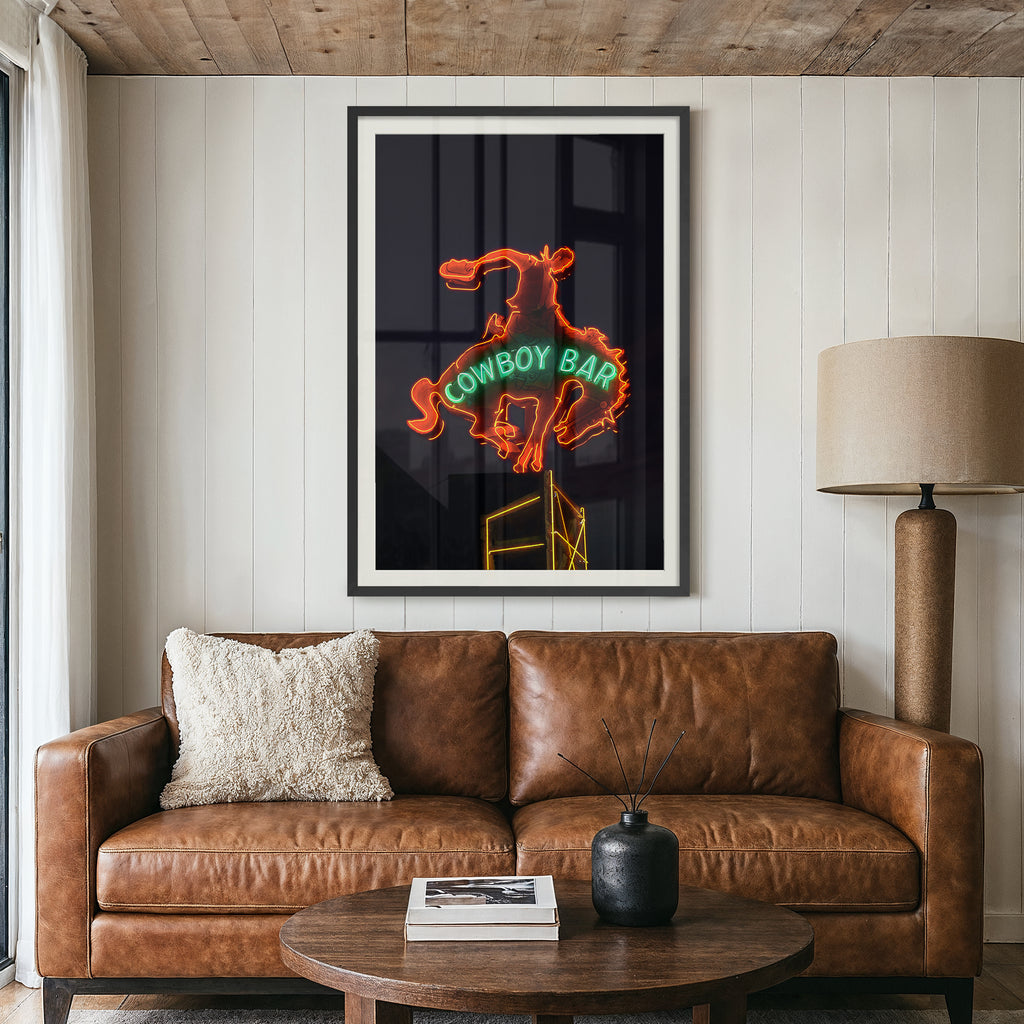 A glowing slice of Western Americana captured against the night sky — the iconic Million Dollar Cowboy Bar sign in Jackson Hole, Wyoming. The vivid red neon outlines a bronc rider mid-buck, while electric green letters spell out COWBOY BAR across the horse’s side. The sign radiates warmth and grit, its vintage glow evoking decades of saloon stories, live country music, and the rugged charm of the old West brought to life on the town square.