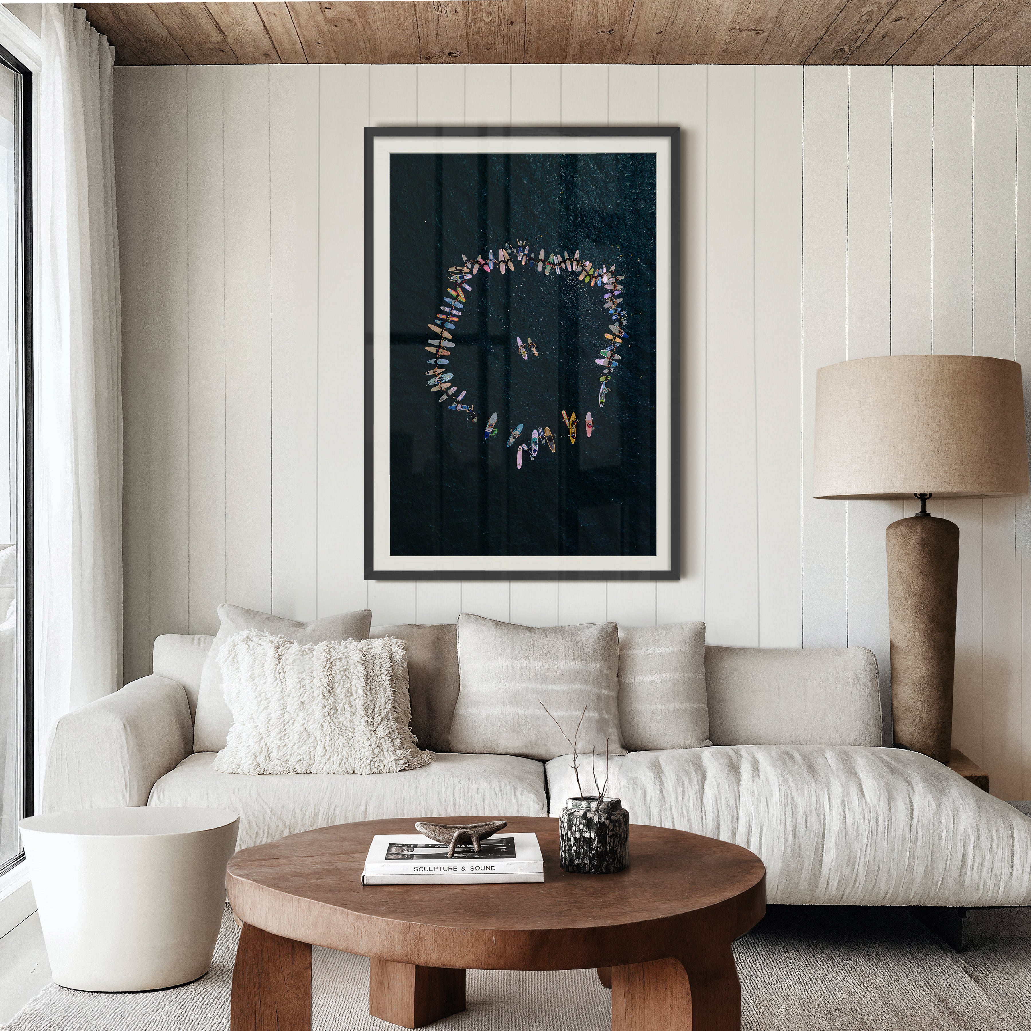 Framed Art Prints feature a contemporary high quality solid wood frame. Pieces come ready to hang with a wire hanger and paper backing. Framed with a white, 2" matte border.