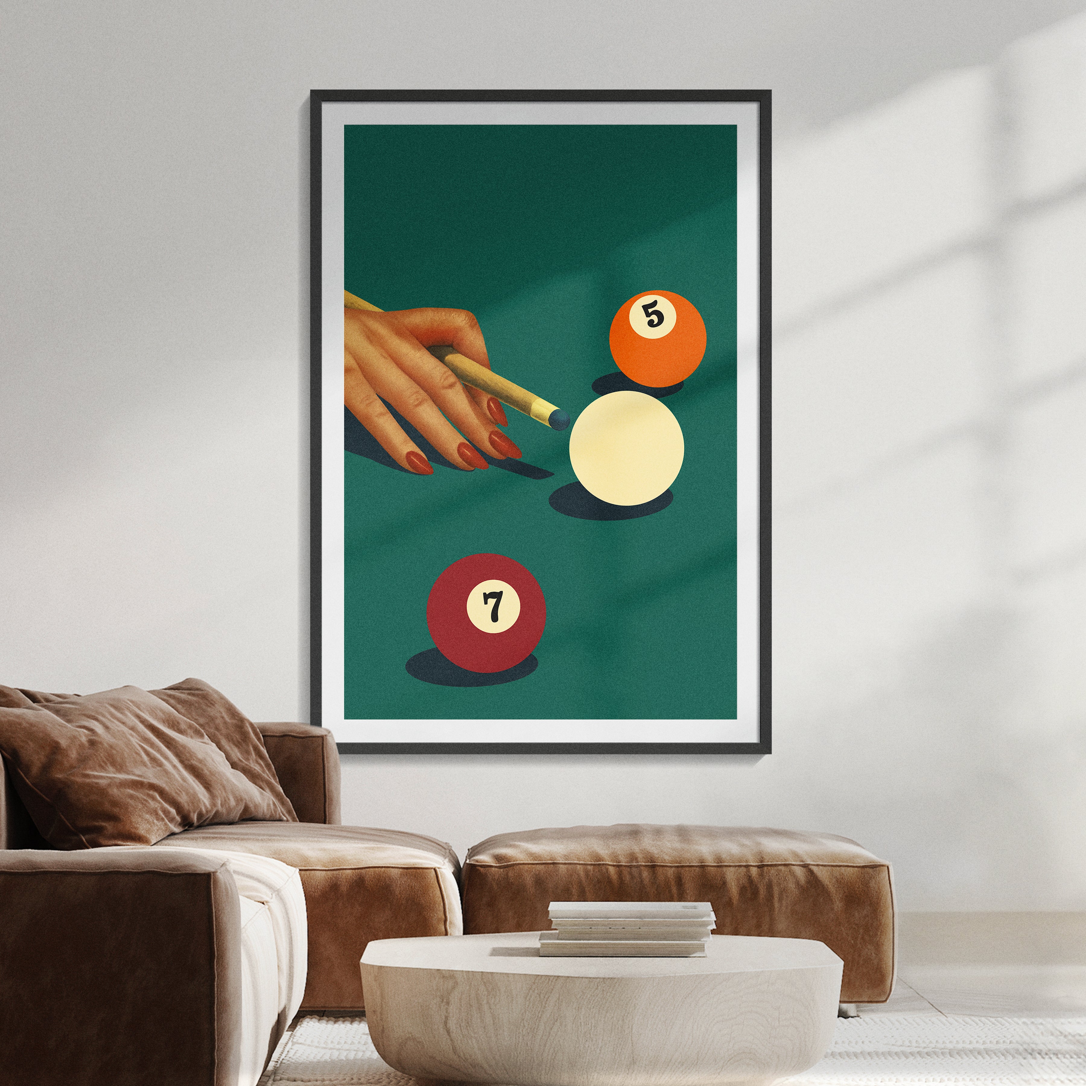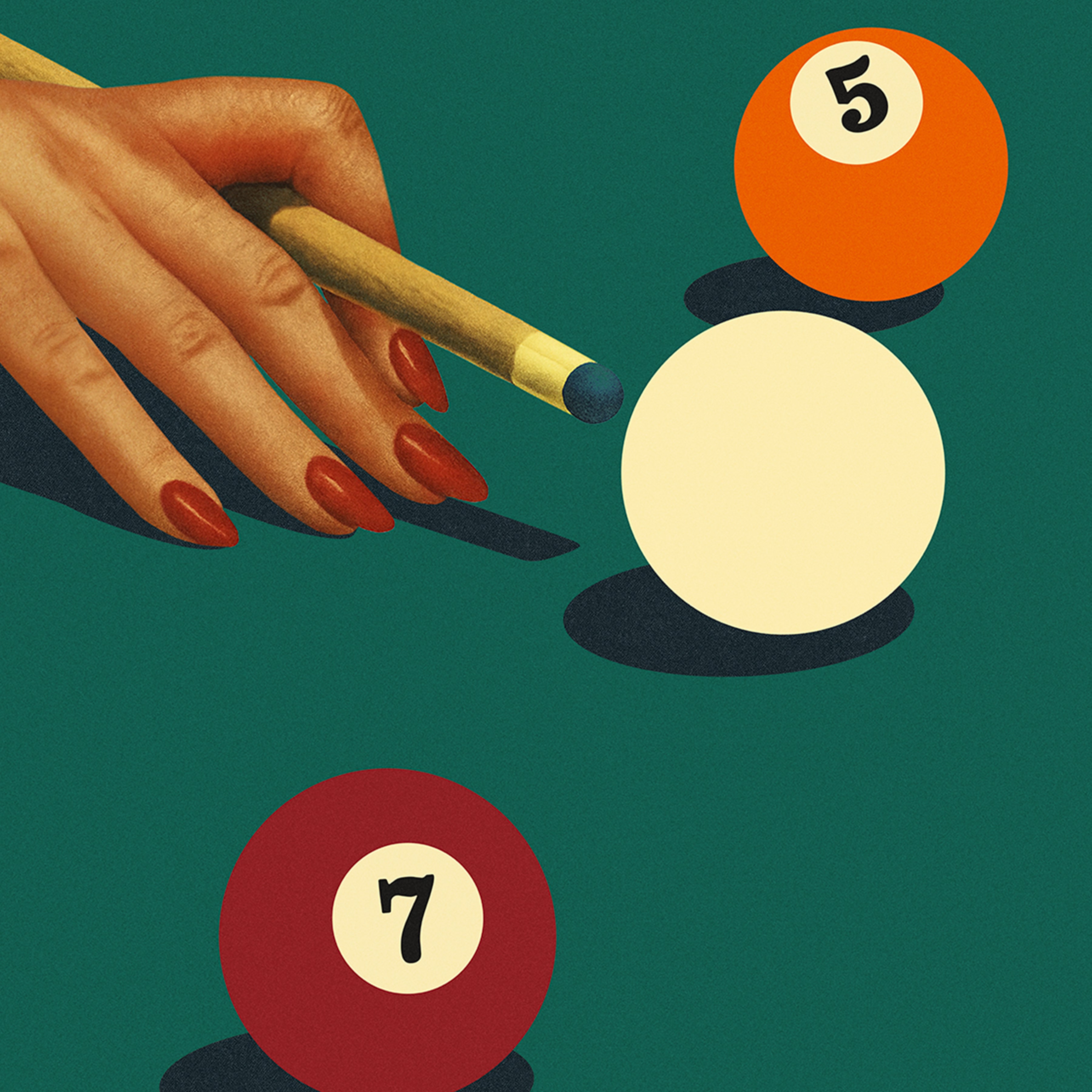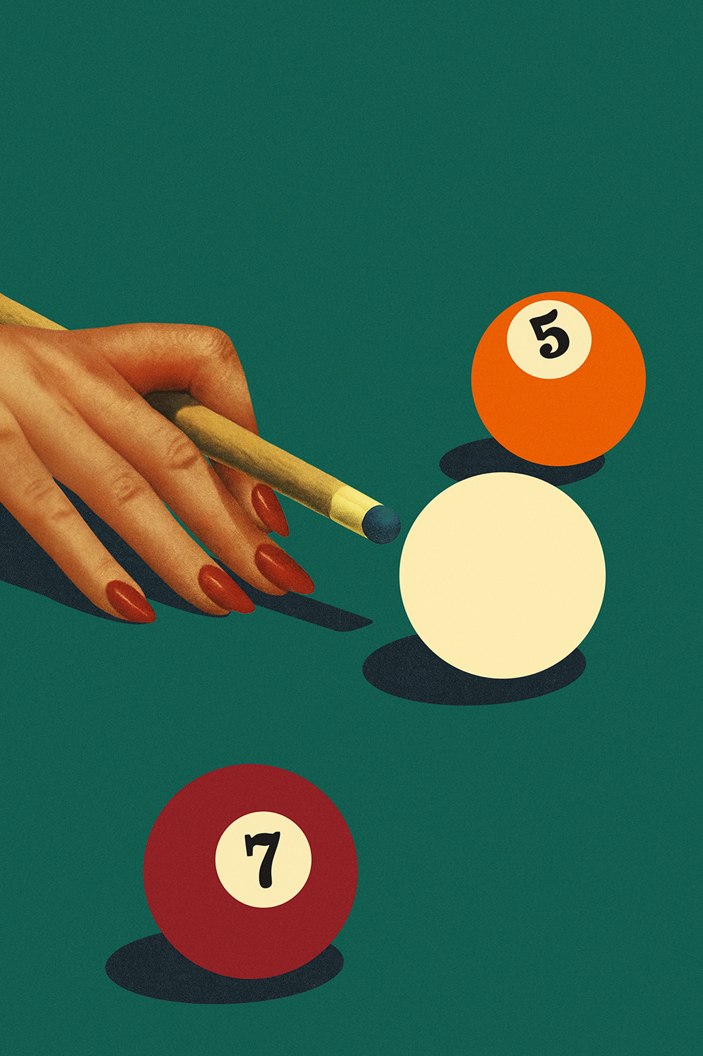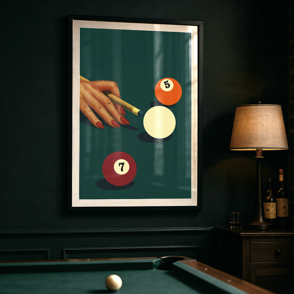 The room hums low — brass light, smoke hanging still, a quiet record turning somewhere out of frame. A manicured hand steadies the cue, red nails catching the glow. The felt breathes green under dim gold, its texture like velvet caught between sin and symmetry.