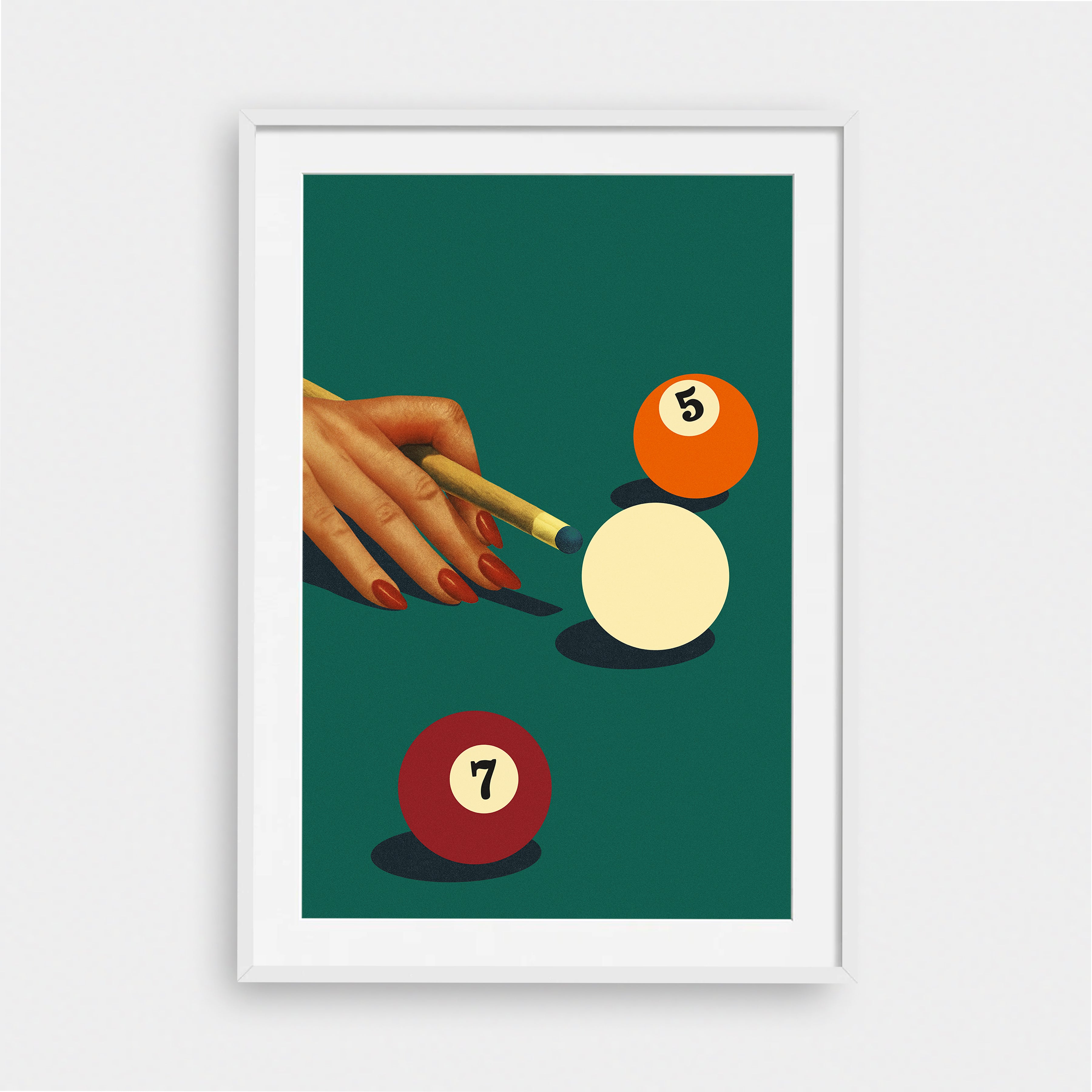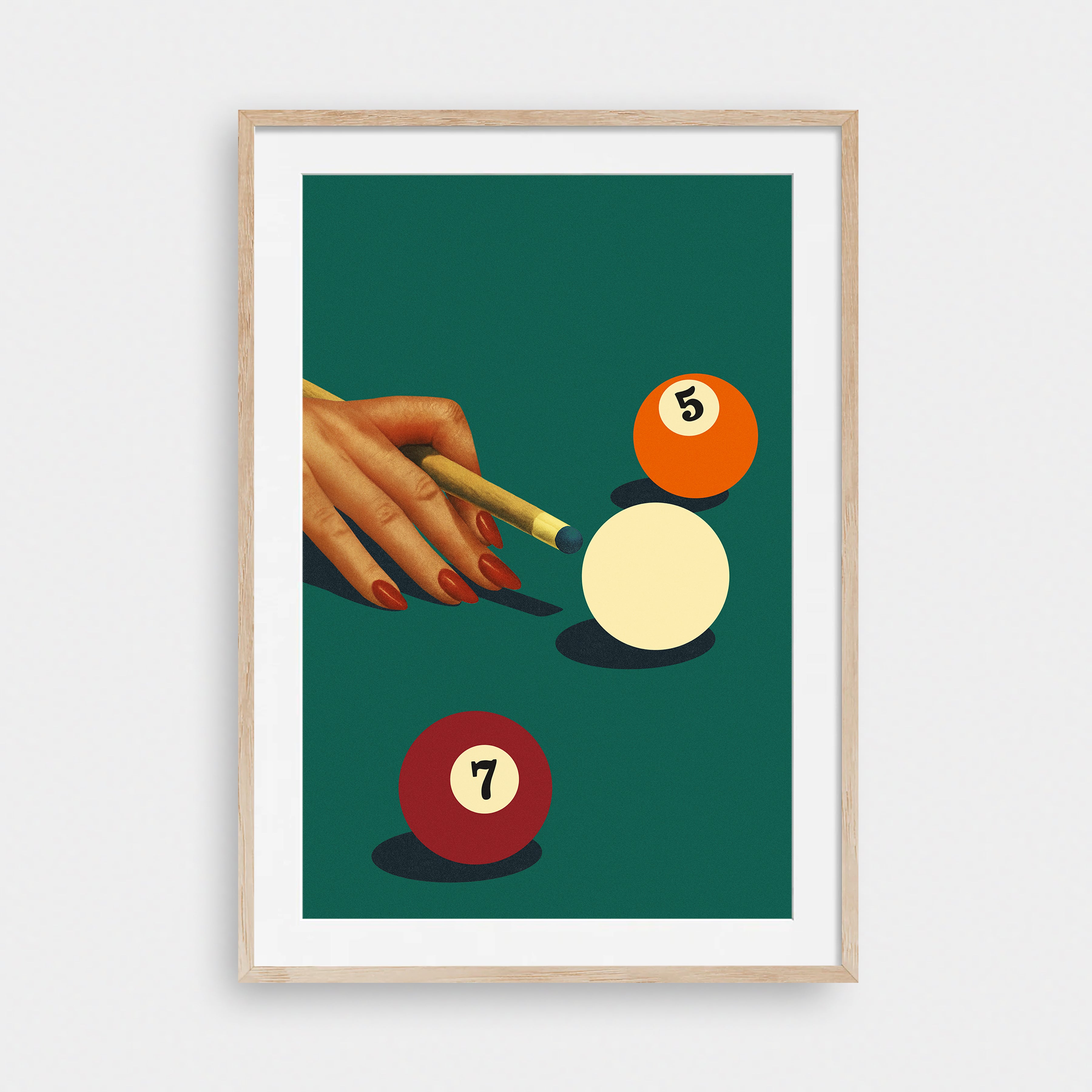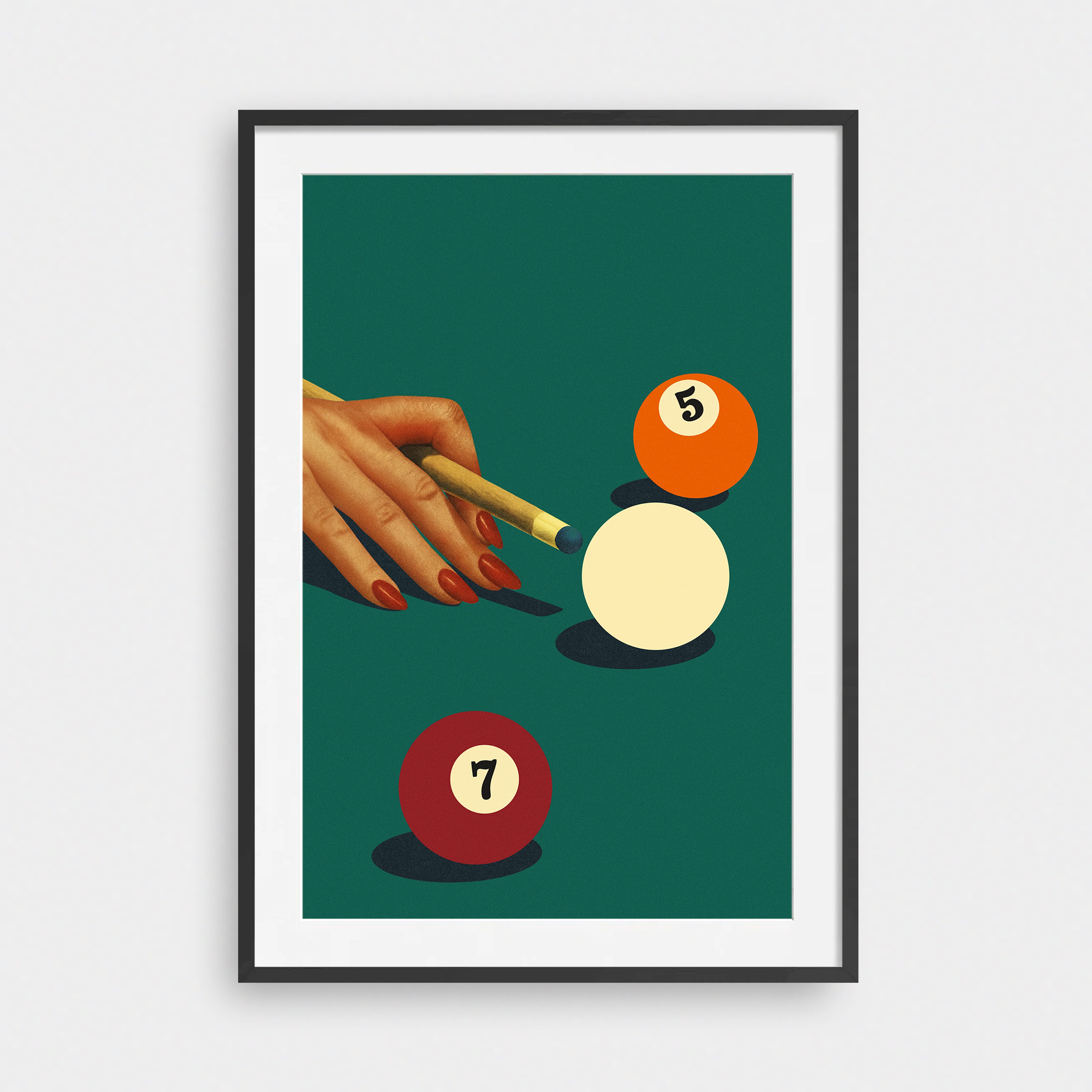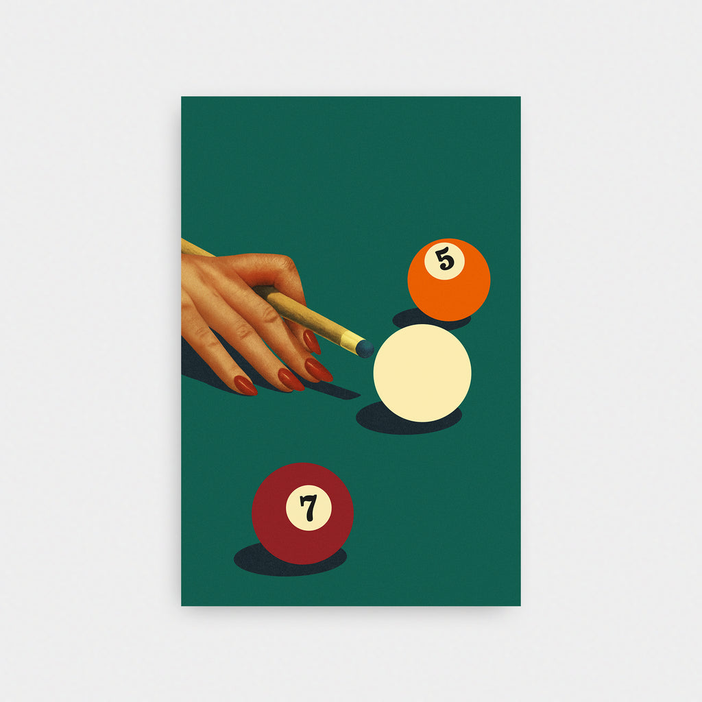 The room hums low — brass light, smoke hanging still, a quiet record turning somewhere out of frame. A manicured hand steadies the cue, red nails catching the glow. The felt breathes green under dim gold, its texture like velvet caught between sin and symmetry.