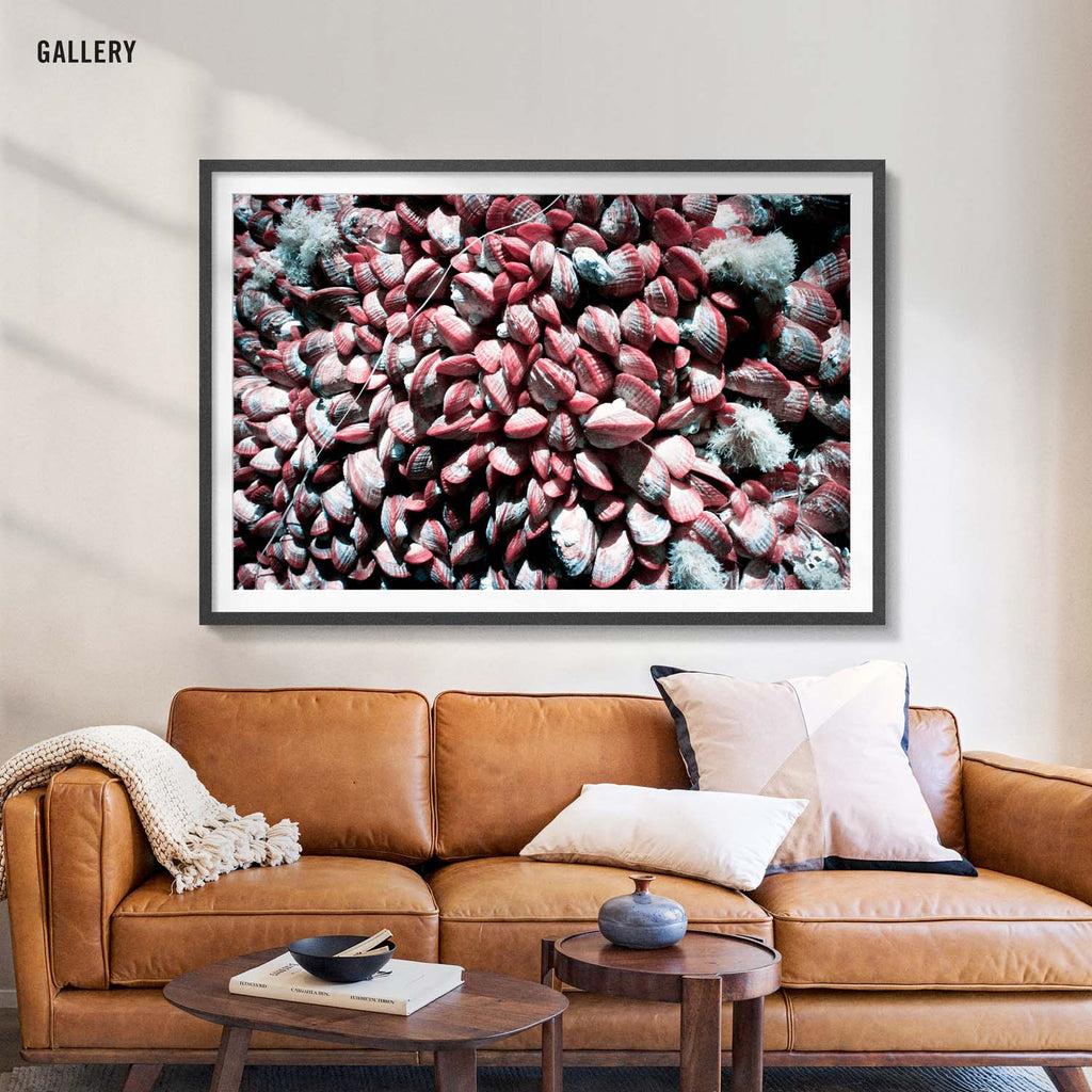 Framed Art Prints feature a contemporary high quality solid wood frame. Pieces come ready to hang with a wire hanger and paper backing. Framed with a white, 2" matte border.