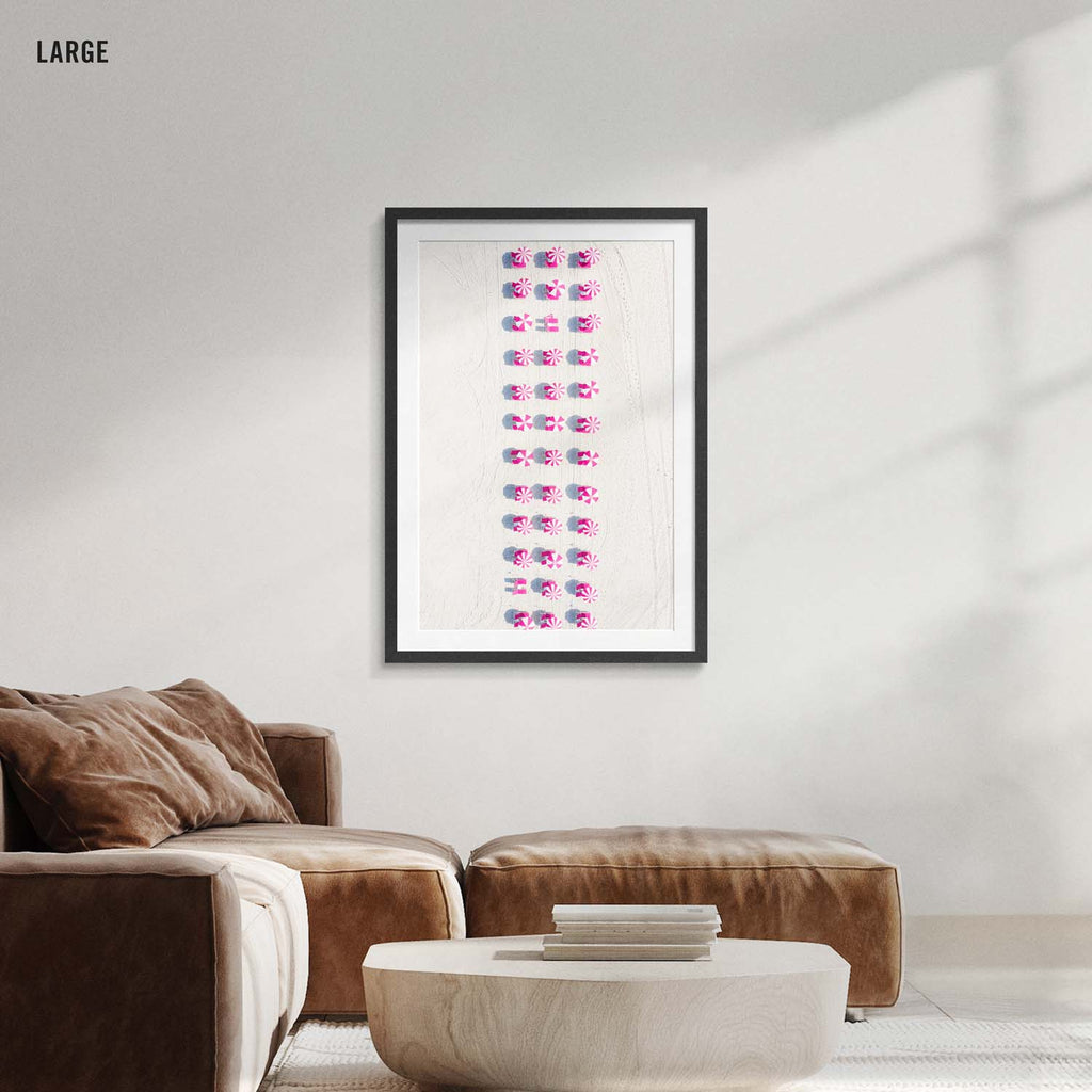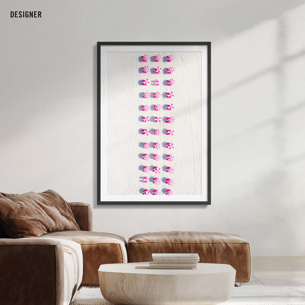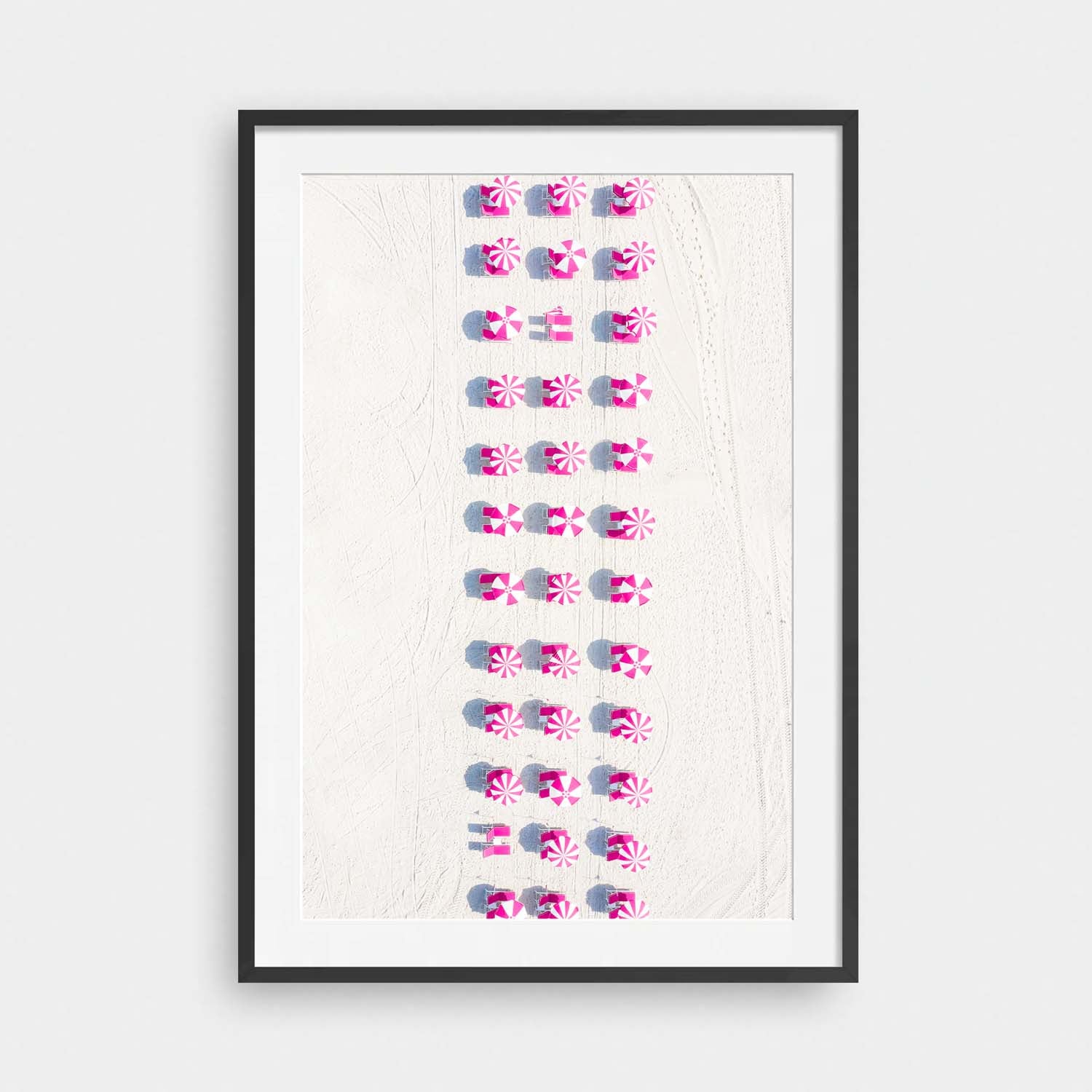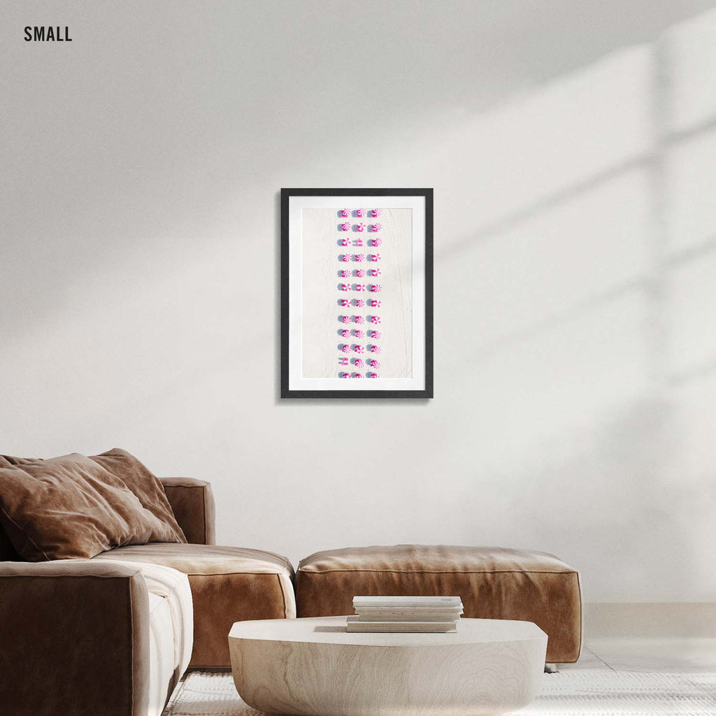 Framed Art Prints feature a contemporary high quality solid wood frame. Pieces come ready to hang with a wire hanger and paper backing. Framed with a white, 2" matte border.