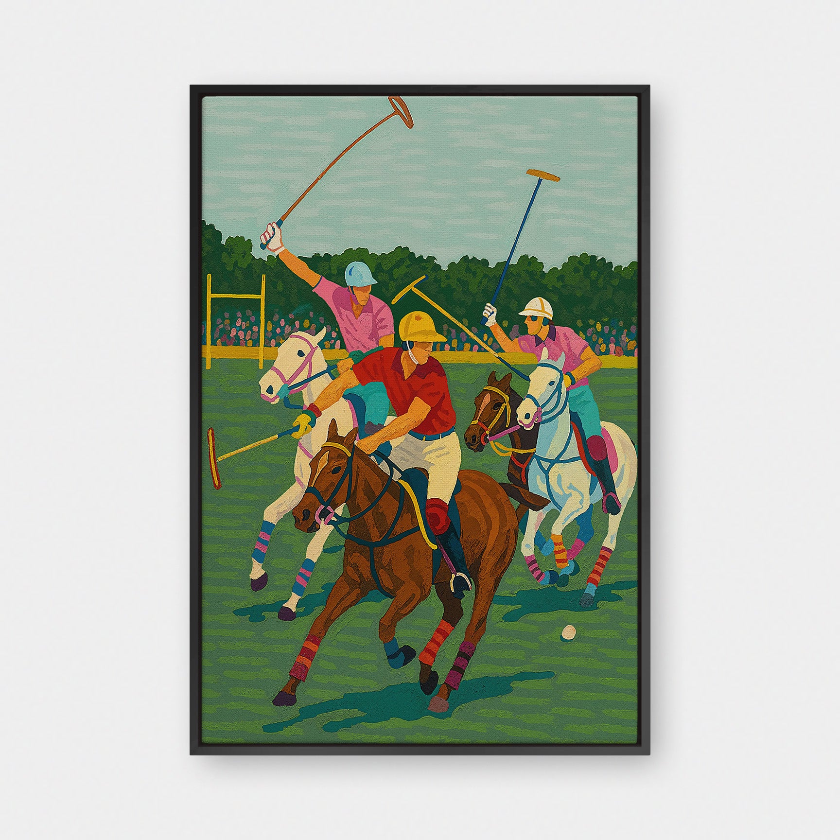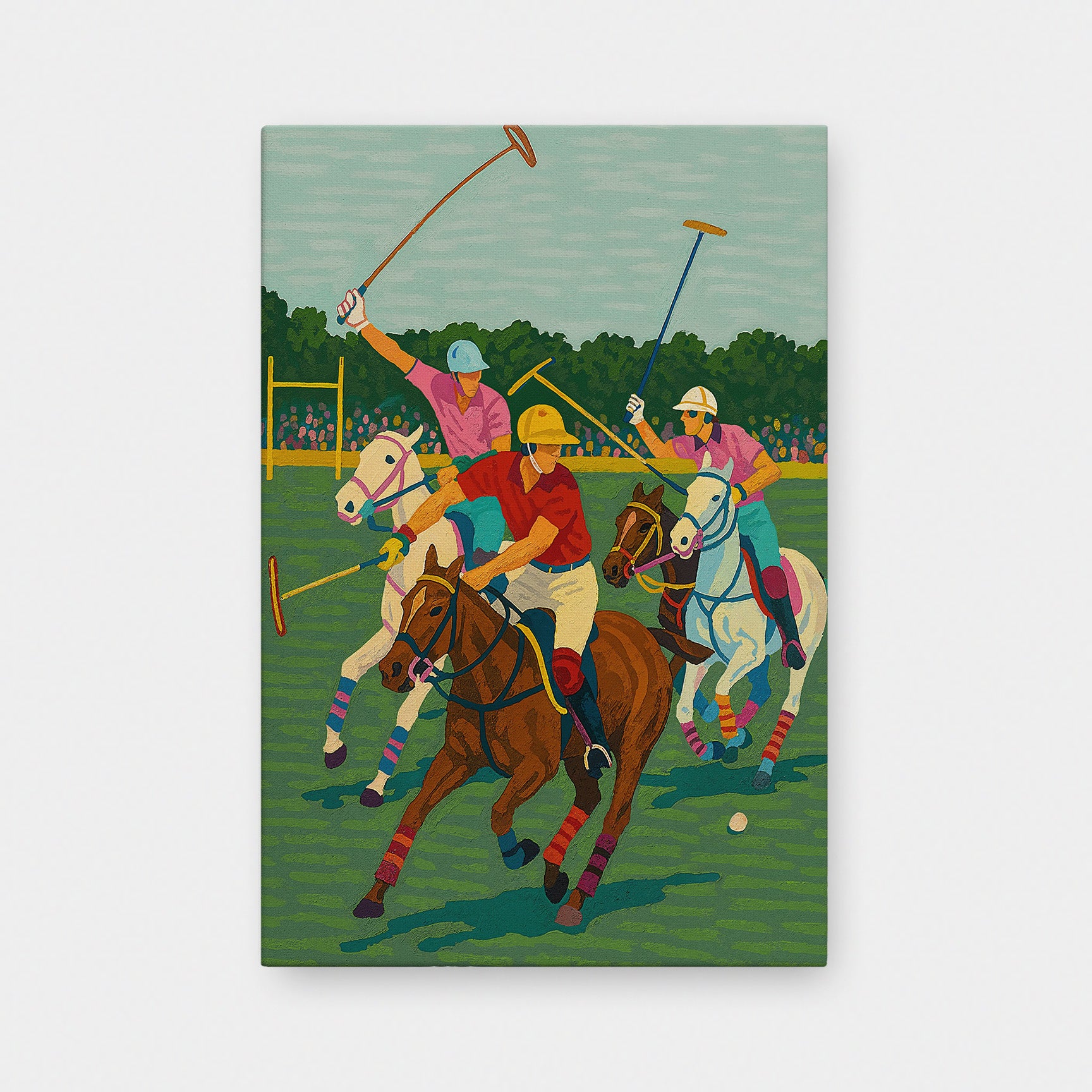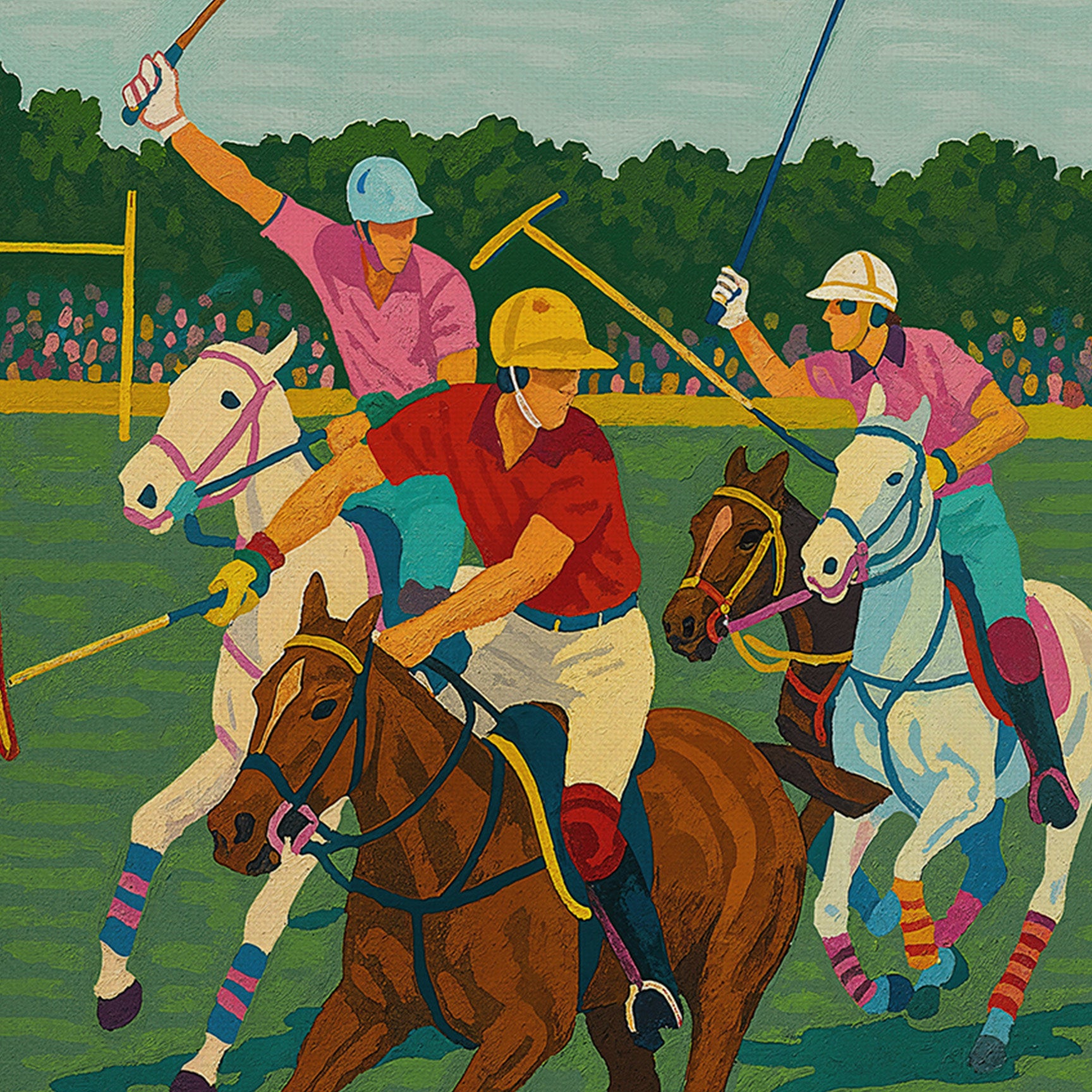 Polo Match captures the chaos, speed, and elegance of the game at its most intense moment. Riders converge in a rush of movement—mallets raised, horses turning sharply, eyes fixed on the ball. The composition feels crowded and kinetic, placing you directly in the action rather than observing from a distance.