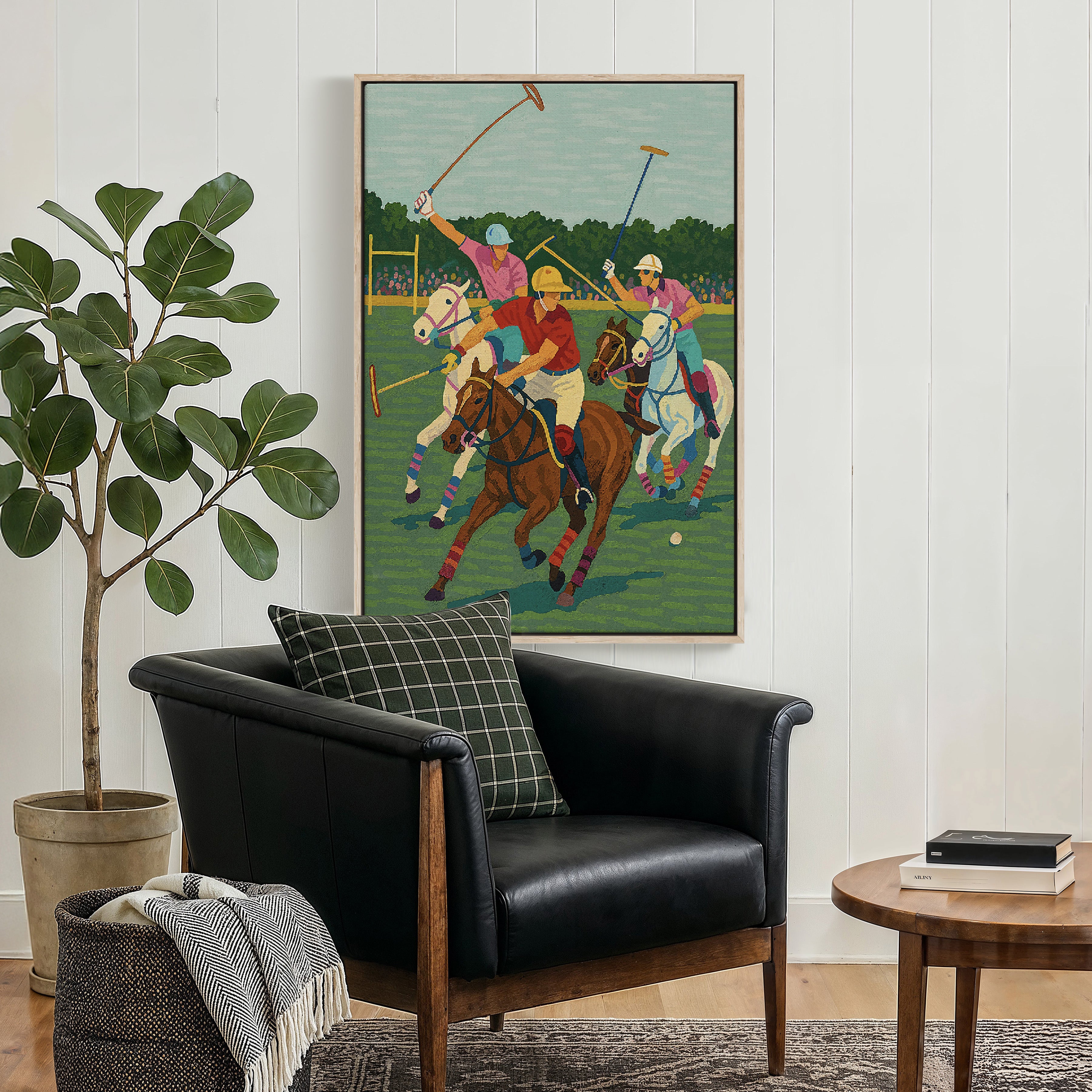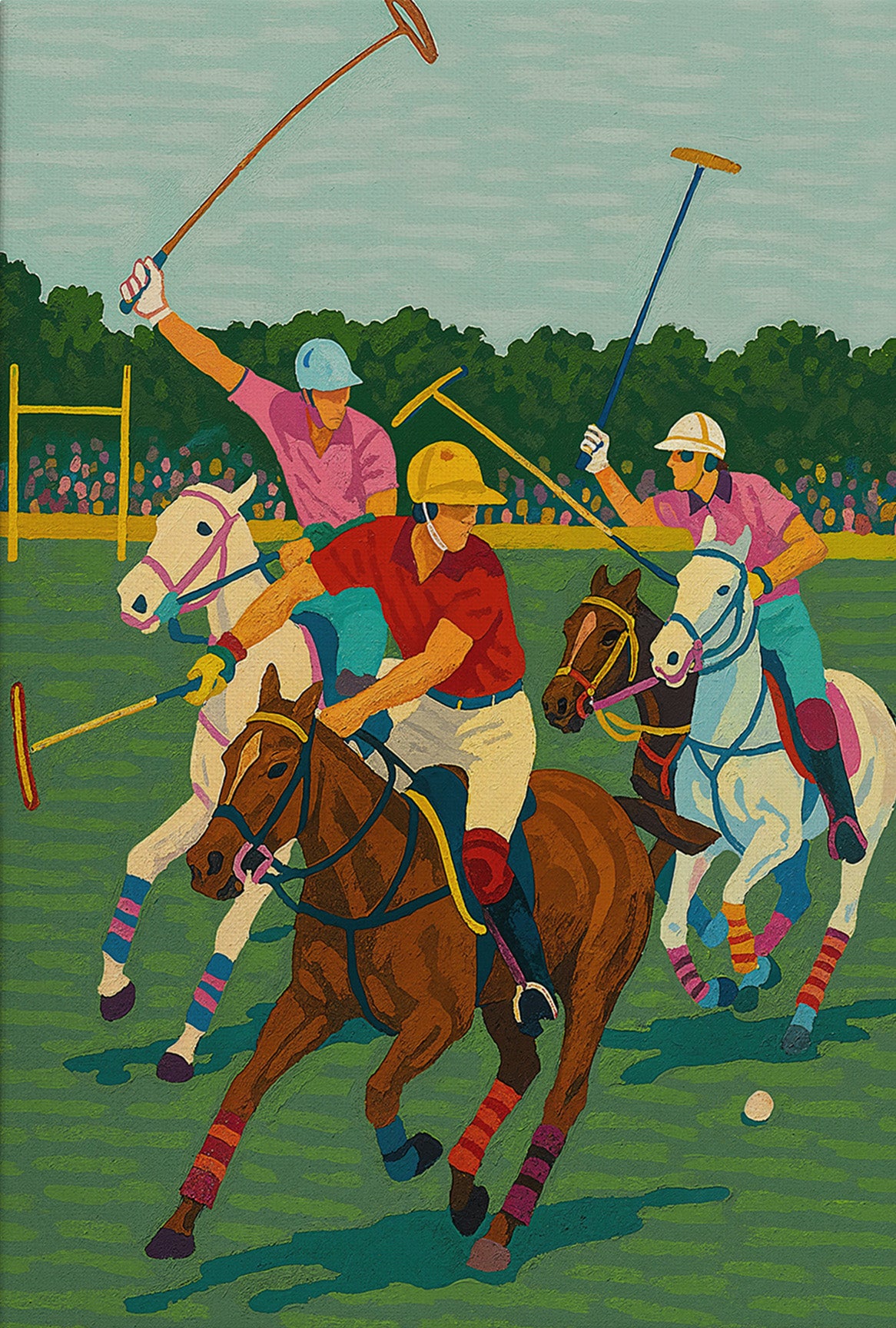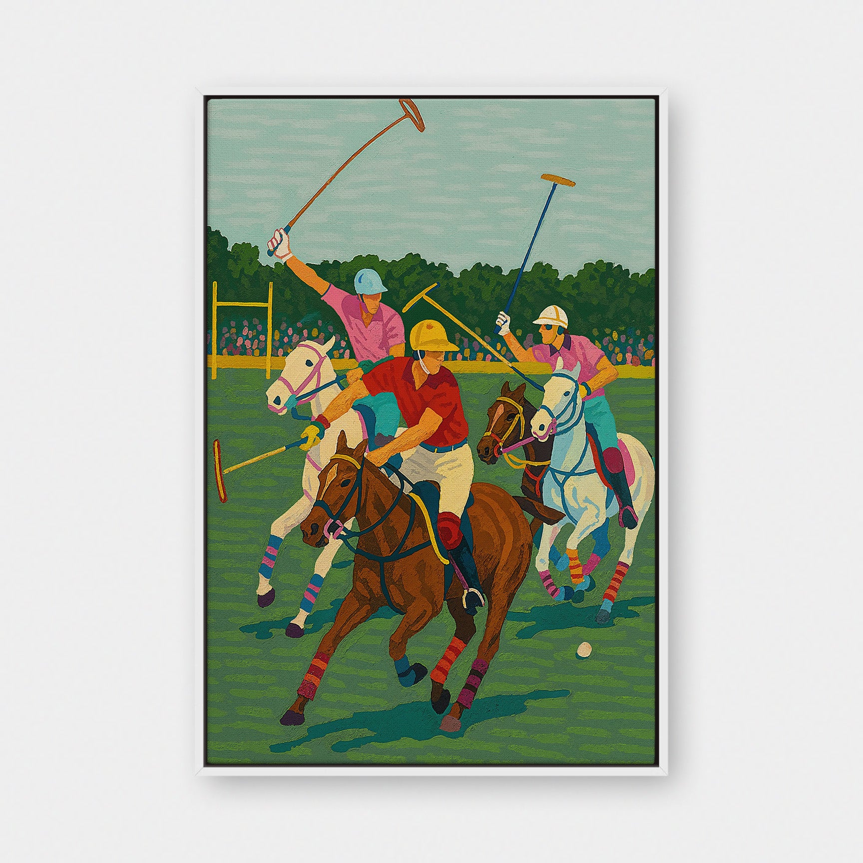 Polo Match captures the chaos, speed, and elegance of the game at its most intense moment. Riders converge in a rush of movement—mallets raised, horses turning sharply, eyes fixed on the ball. The composition feels crowded and kinetic, placing you directly in the action rather than observing from a distance.