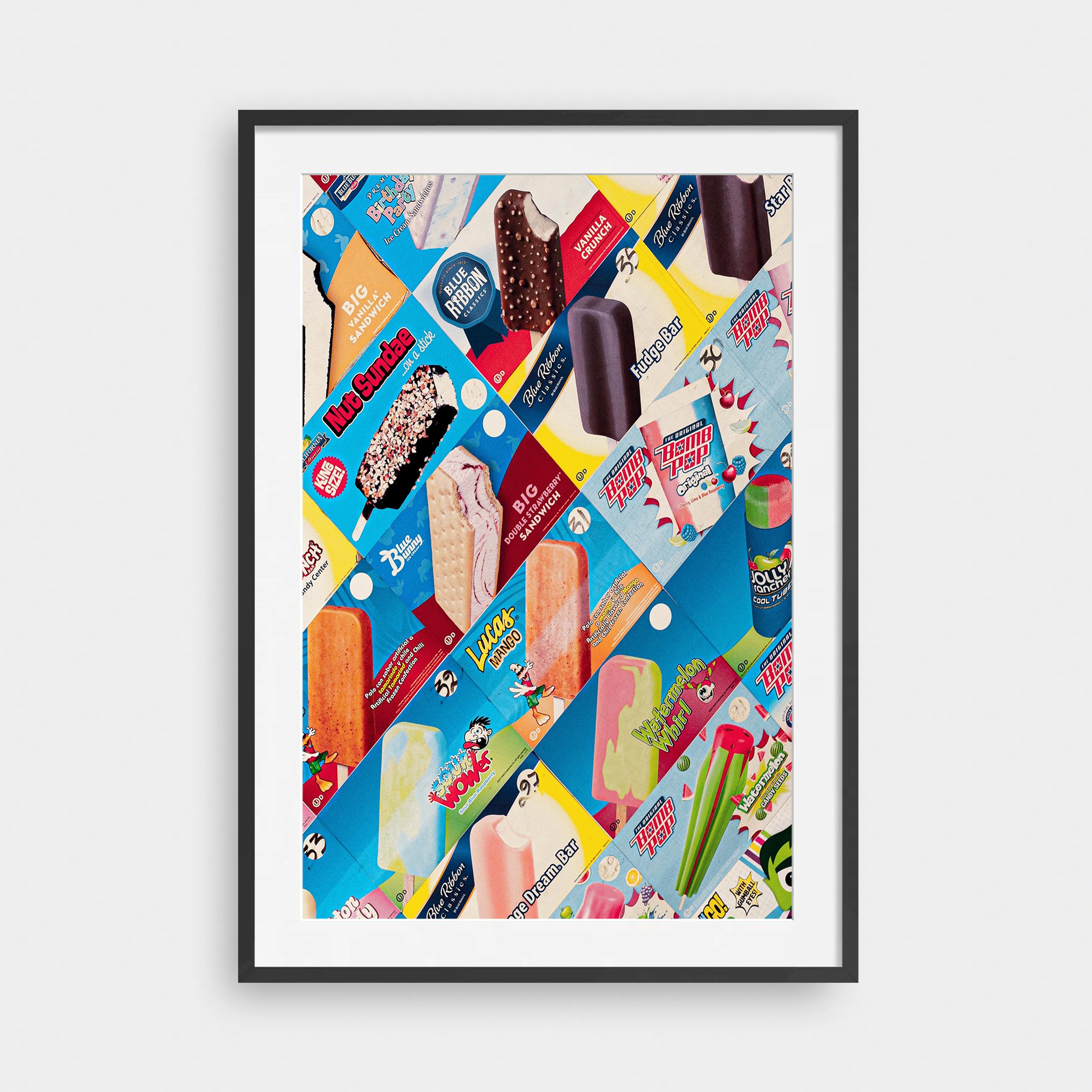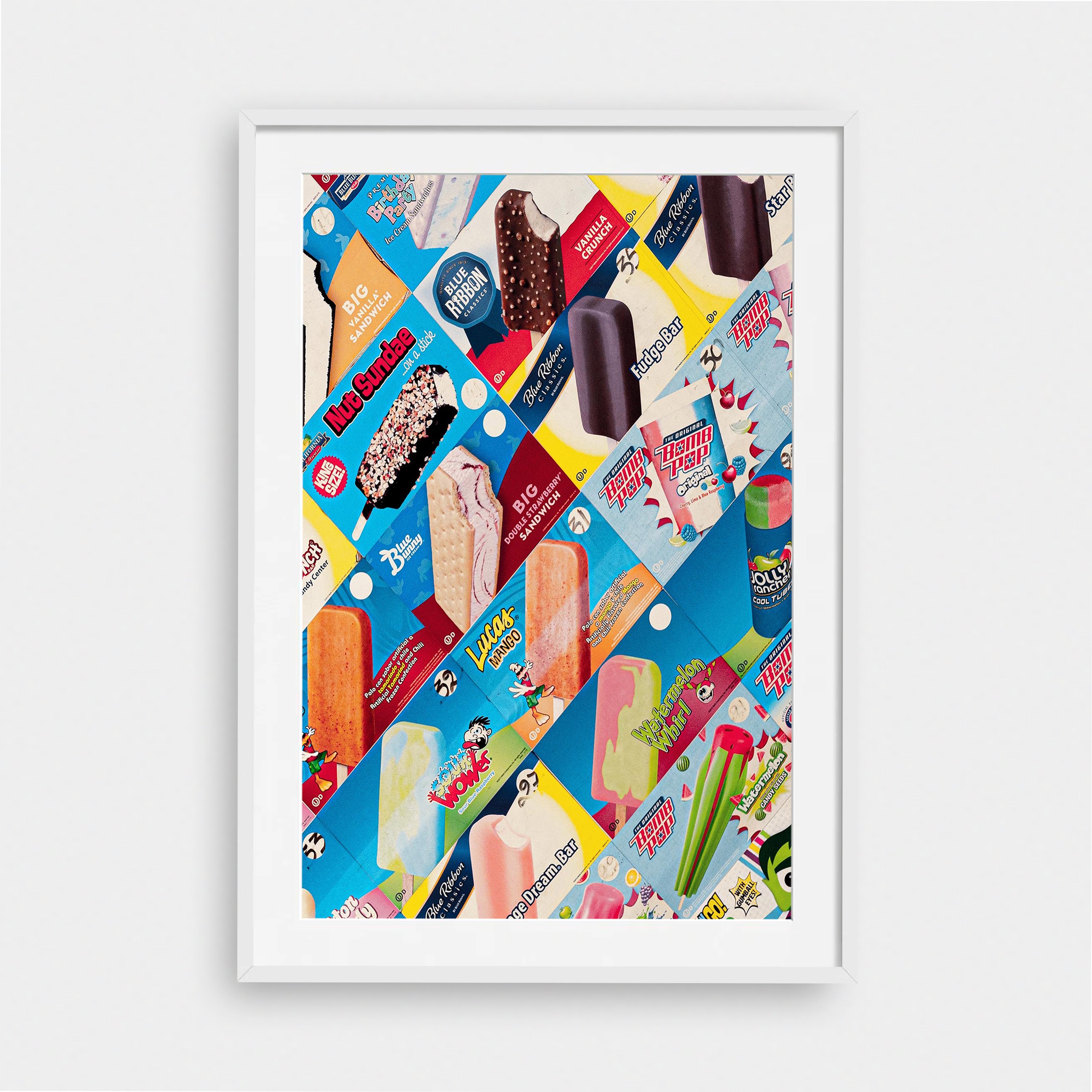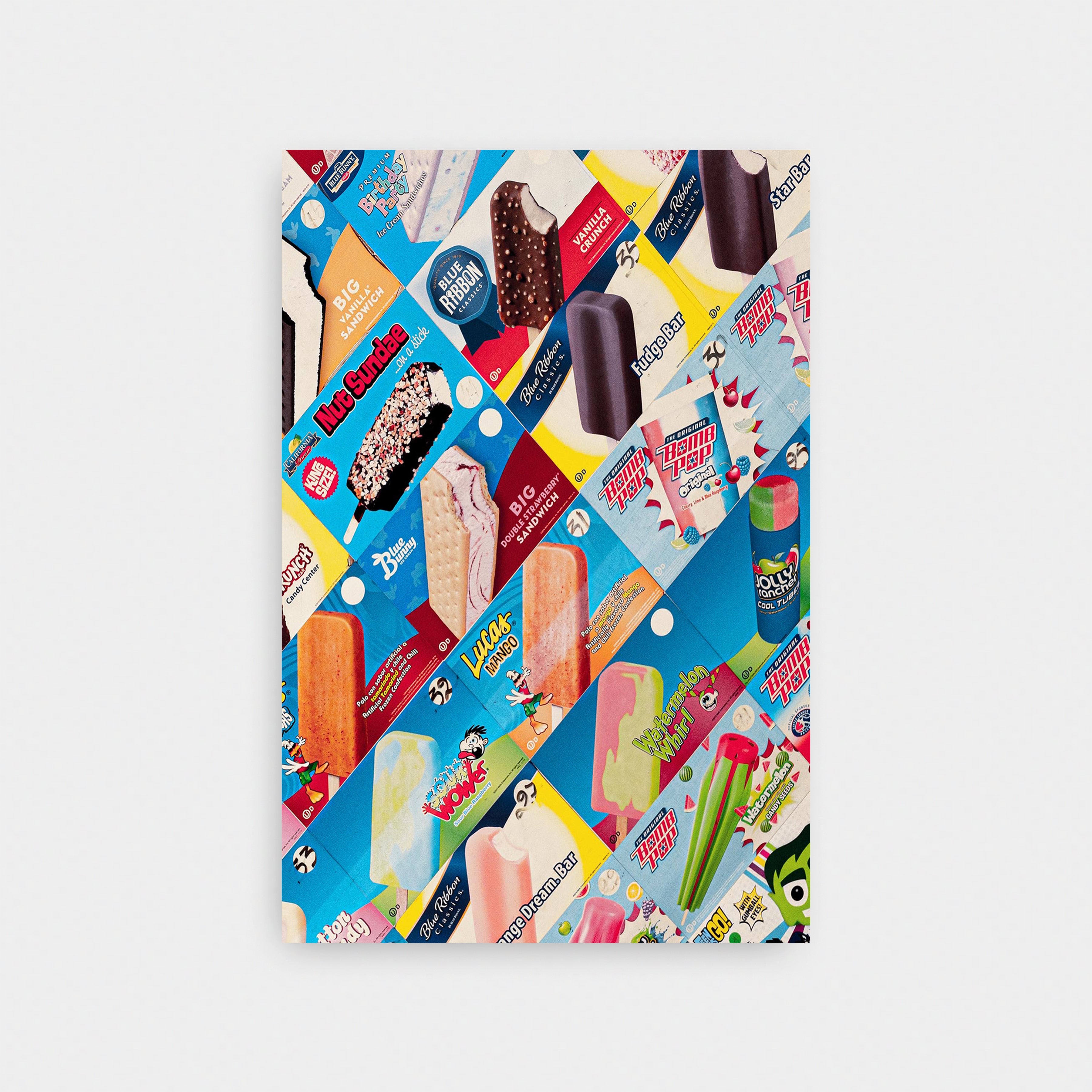 Pops is a bold, nostalgic collision of color, texture, and memory. Familiar ice-cream wrappers—layered, torn, and reassembled—create a vibrant mosaic that feels playful yet intentional. Every brand, flavor, and faded edge carries a sense of summer: sticky fingers, corner stores, and the simple joy of choosing a treat from behind fogged glass.