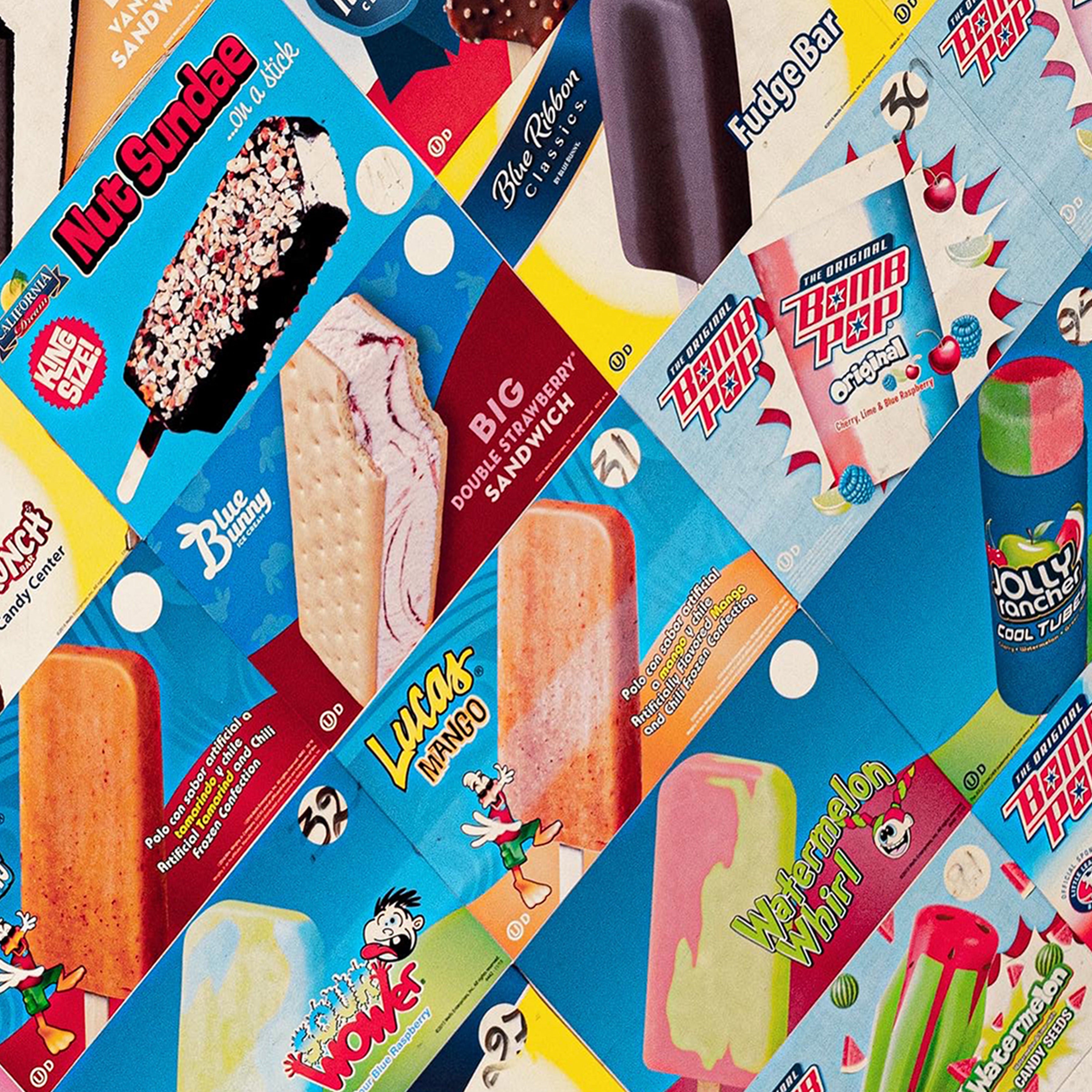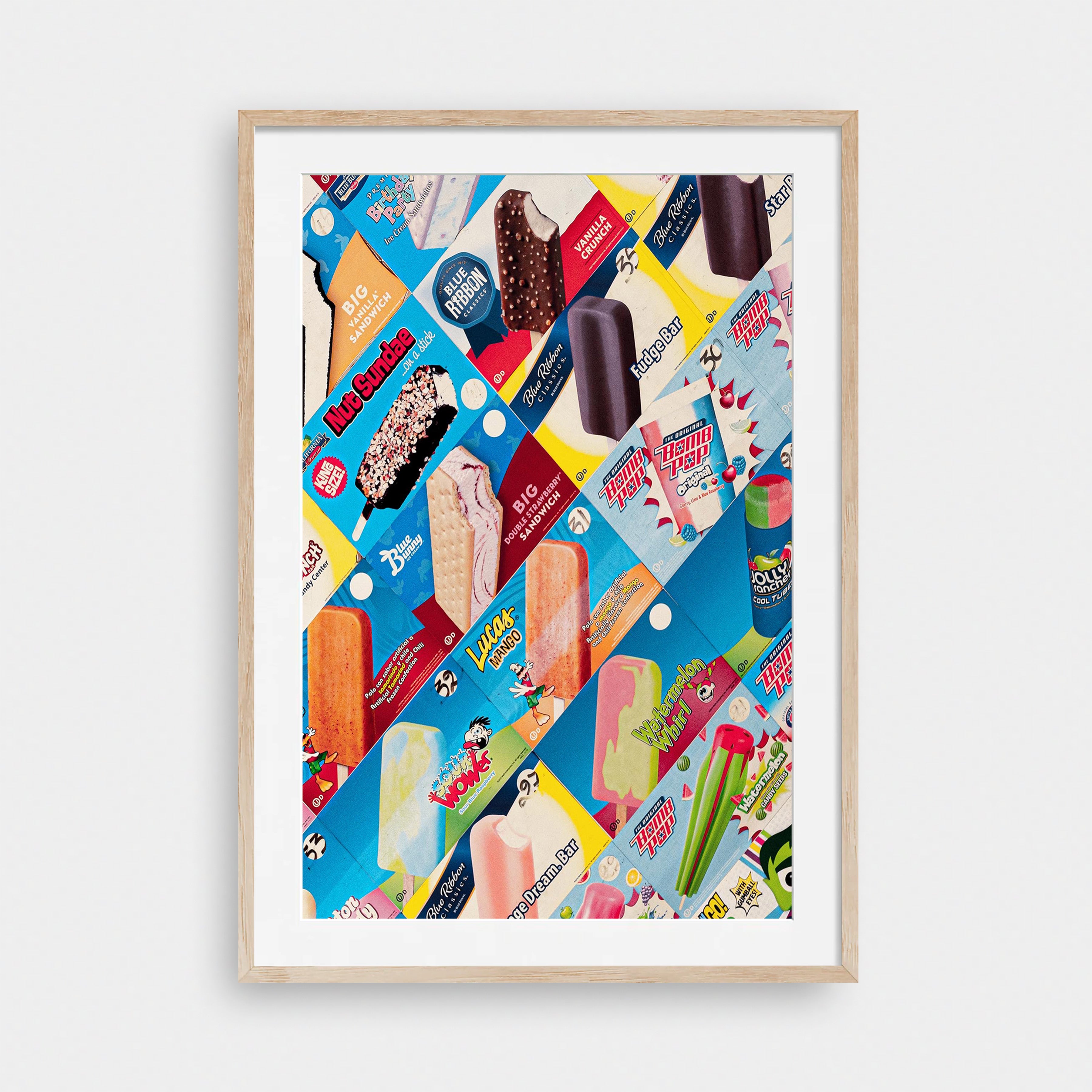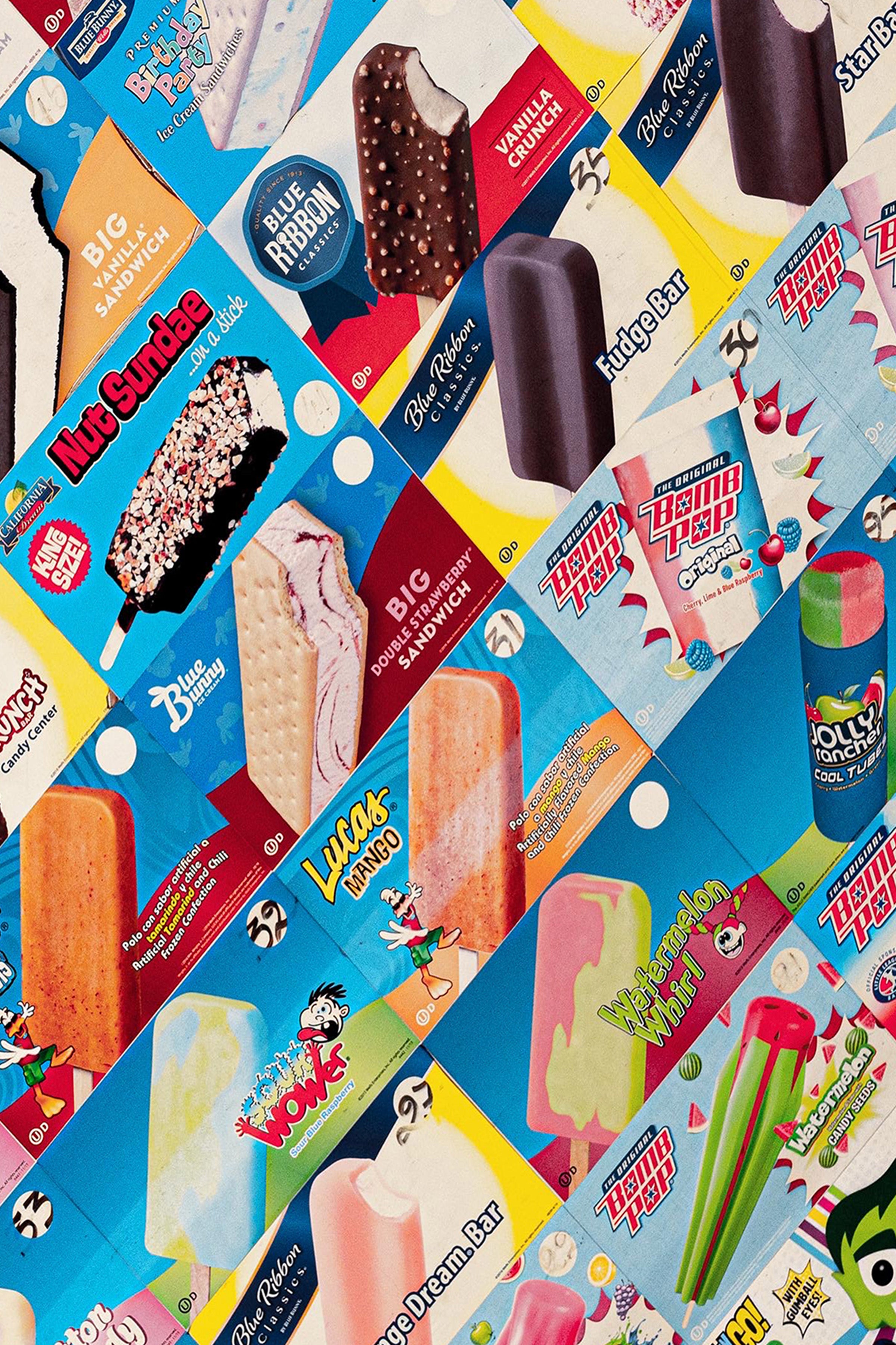 Pops is a bold, nostalgic collision of color, texture, and memory. Familiar ice-cream wrappers—layered, torn, and reassembled—create a vibrant mosaic that feels playful yet intentional. Every brand, flavor, and faded edge carries a sense of summer: sticky fingers, corner stores, and the simple joy of choosing a treat from behind fogged glass.