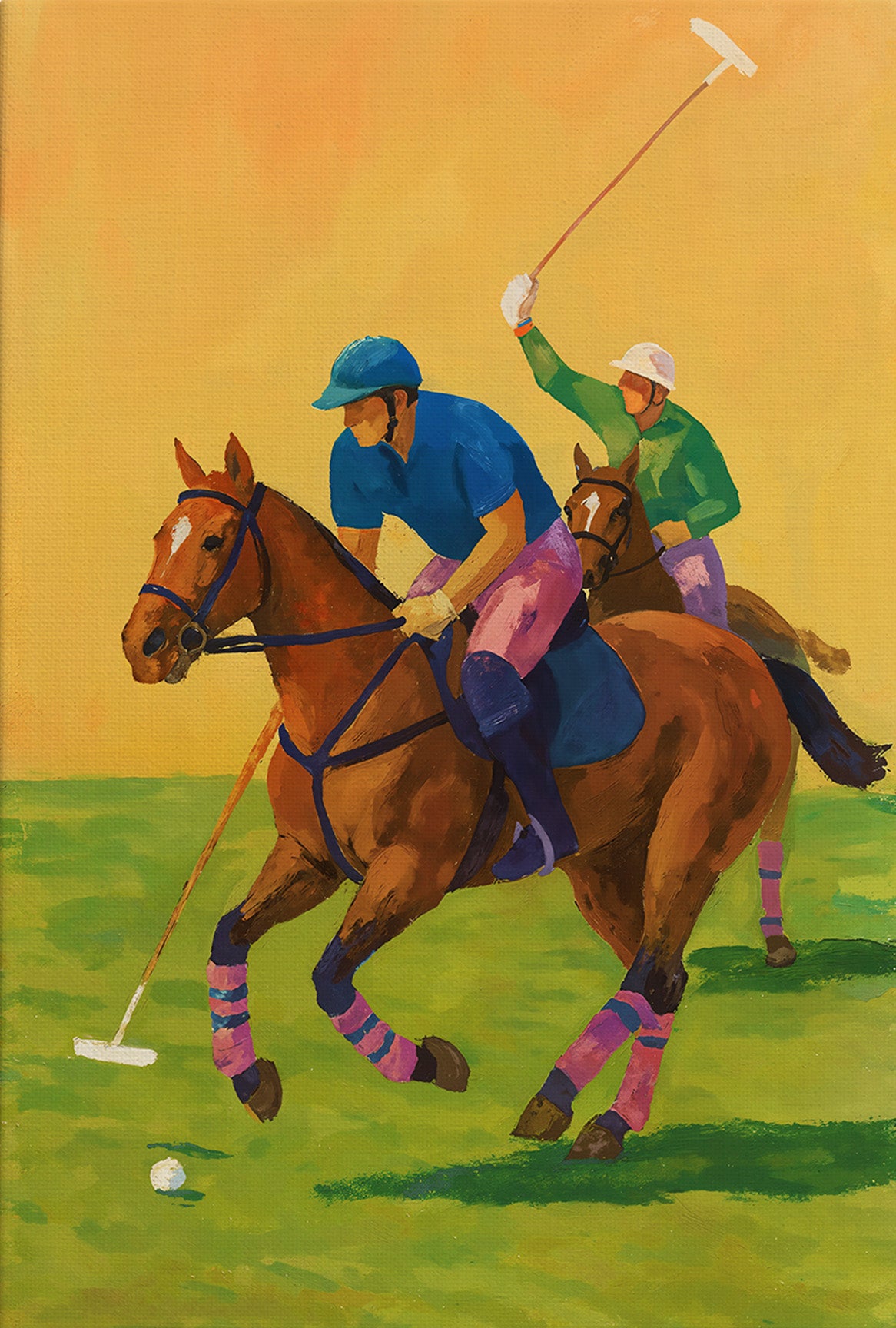 Bold color and simplified forms give the piece its modern edge, while the sweeping yellow sky and open green ground create a sense of space and momentum. There’s a rhythm to the composition, where movement, balance, and anticipation all collide on the field of play.