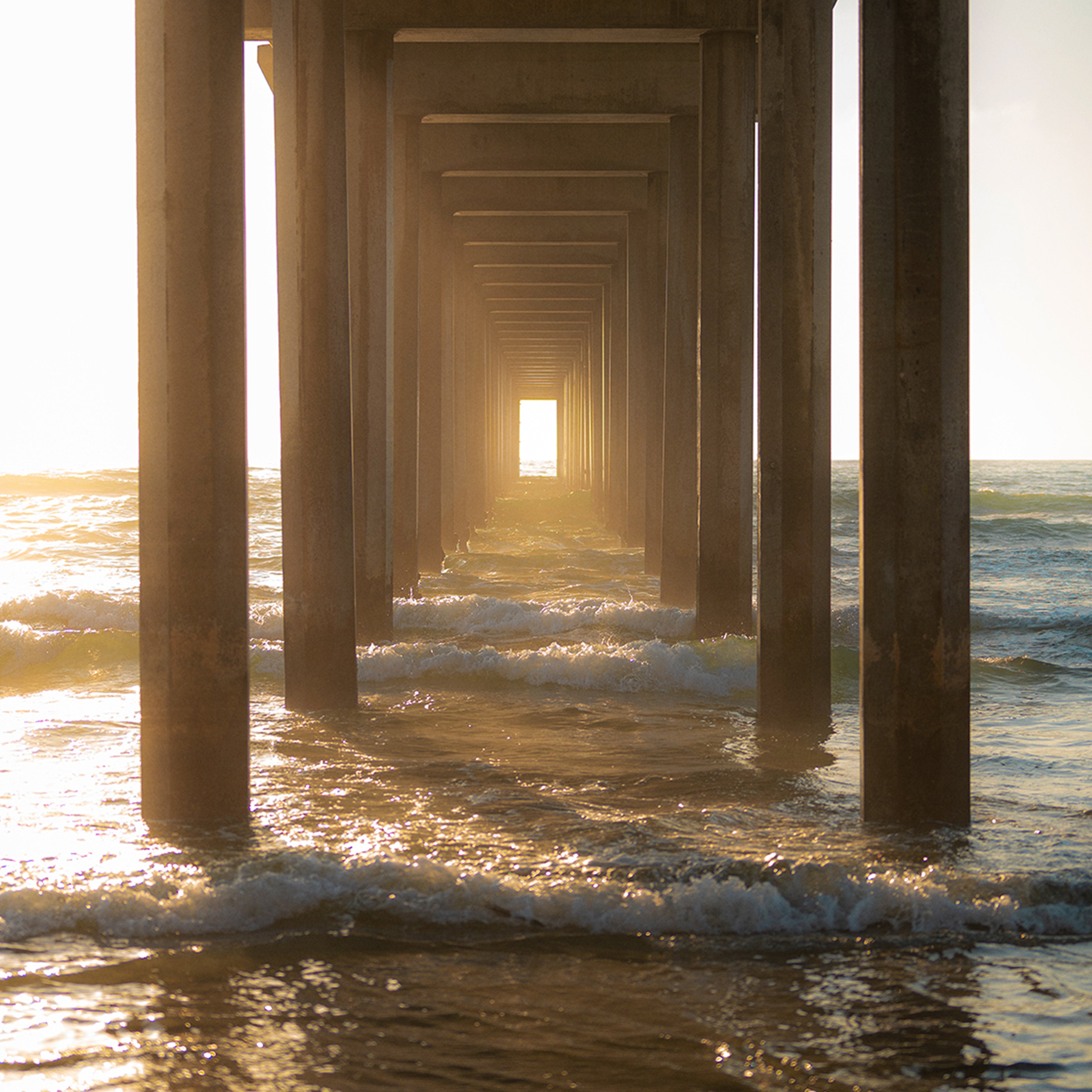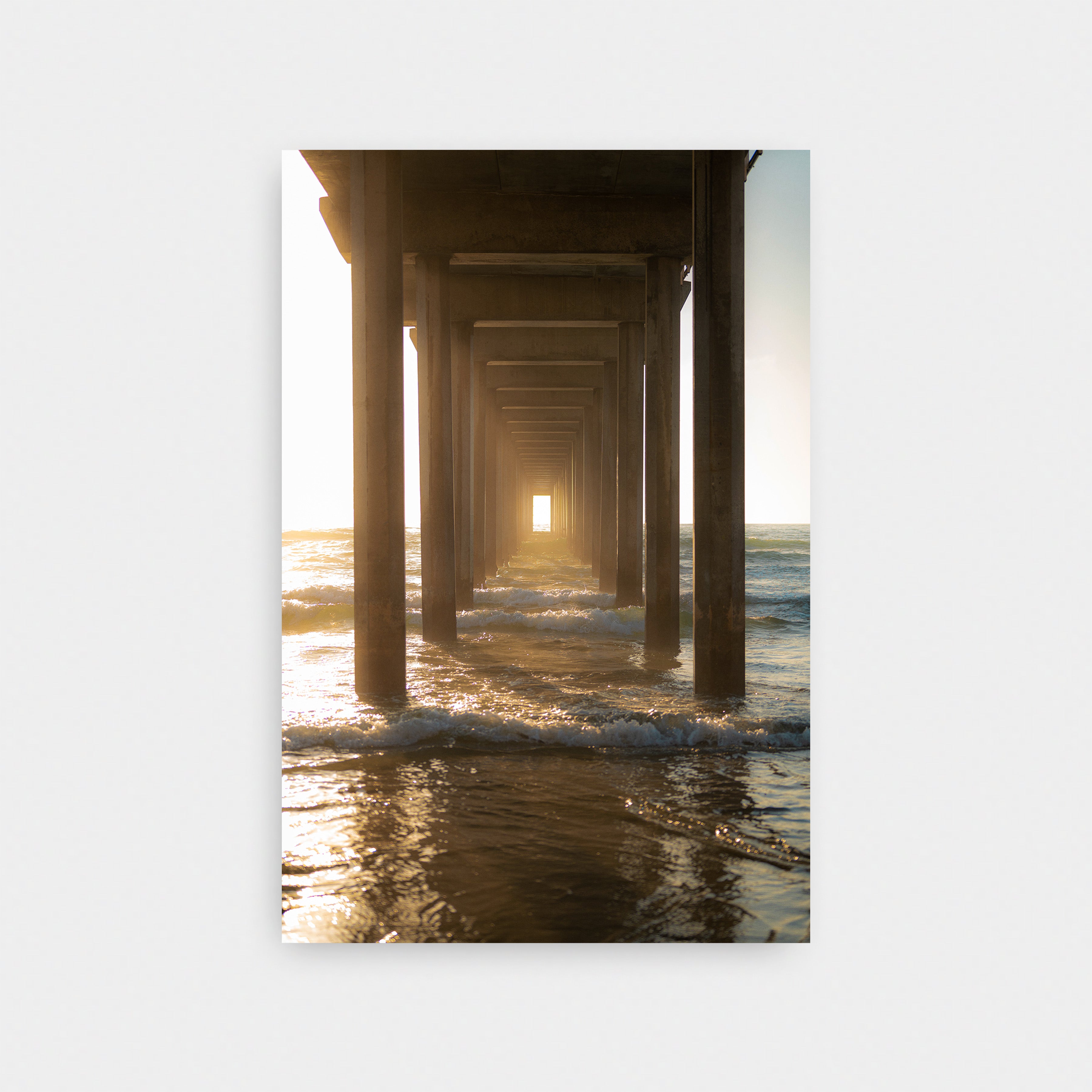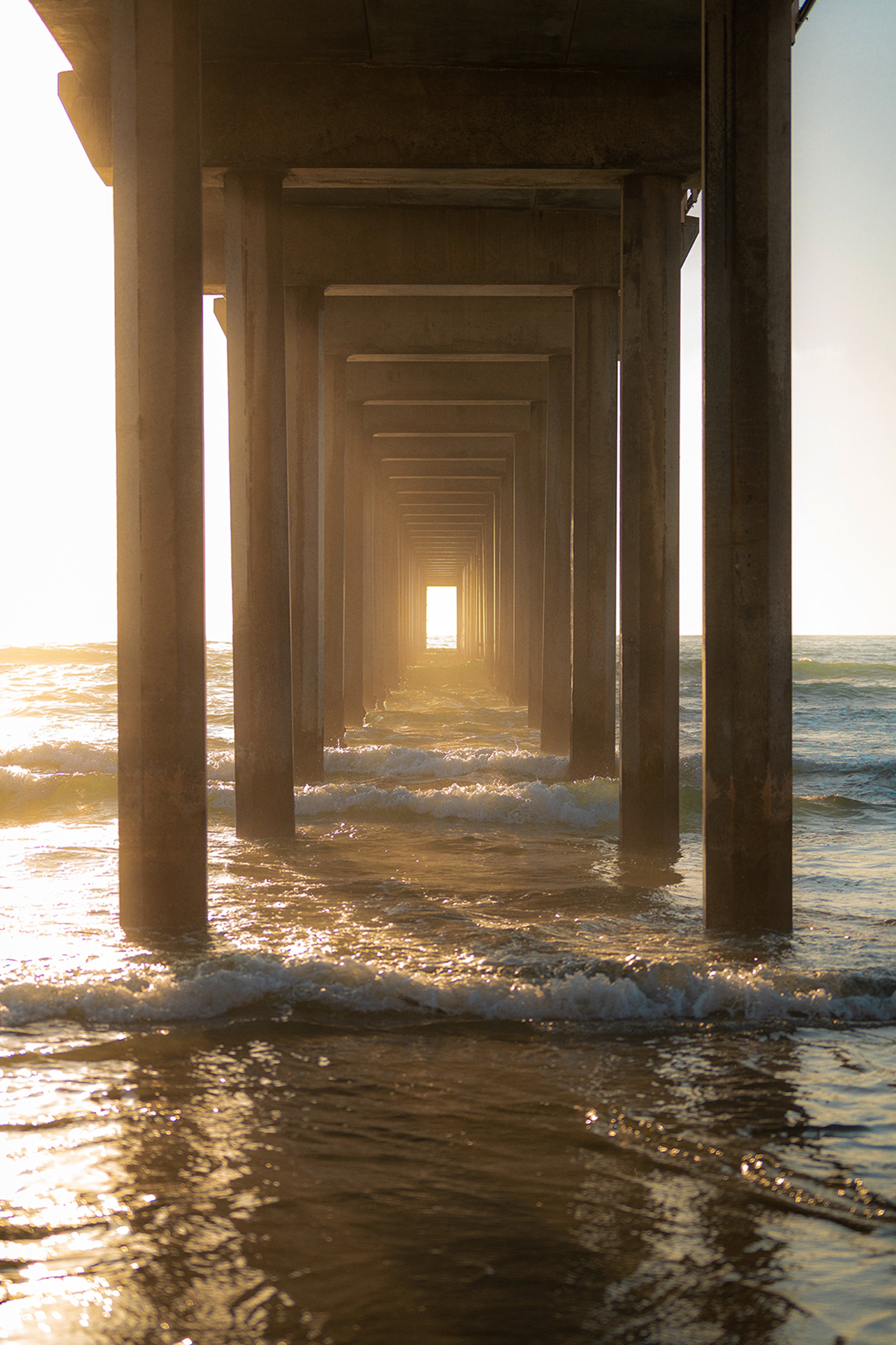Through the Pier draws the viewer into a quiet, almost meditative passage beneath the structure itself. Repeating columns create a strong sense of symmetry and depth, pulling the eye toward a glowing opening of light at the horizon. Waves roll steadily through the frame, catching warm reflections as the sun filters in from the side.