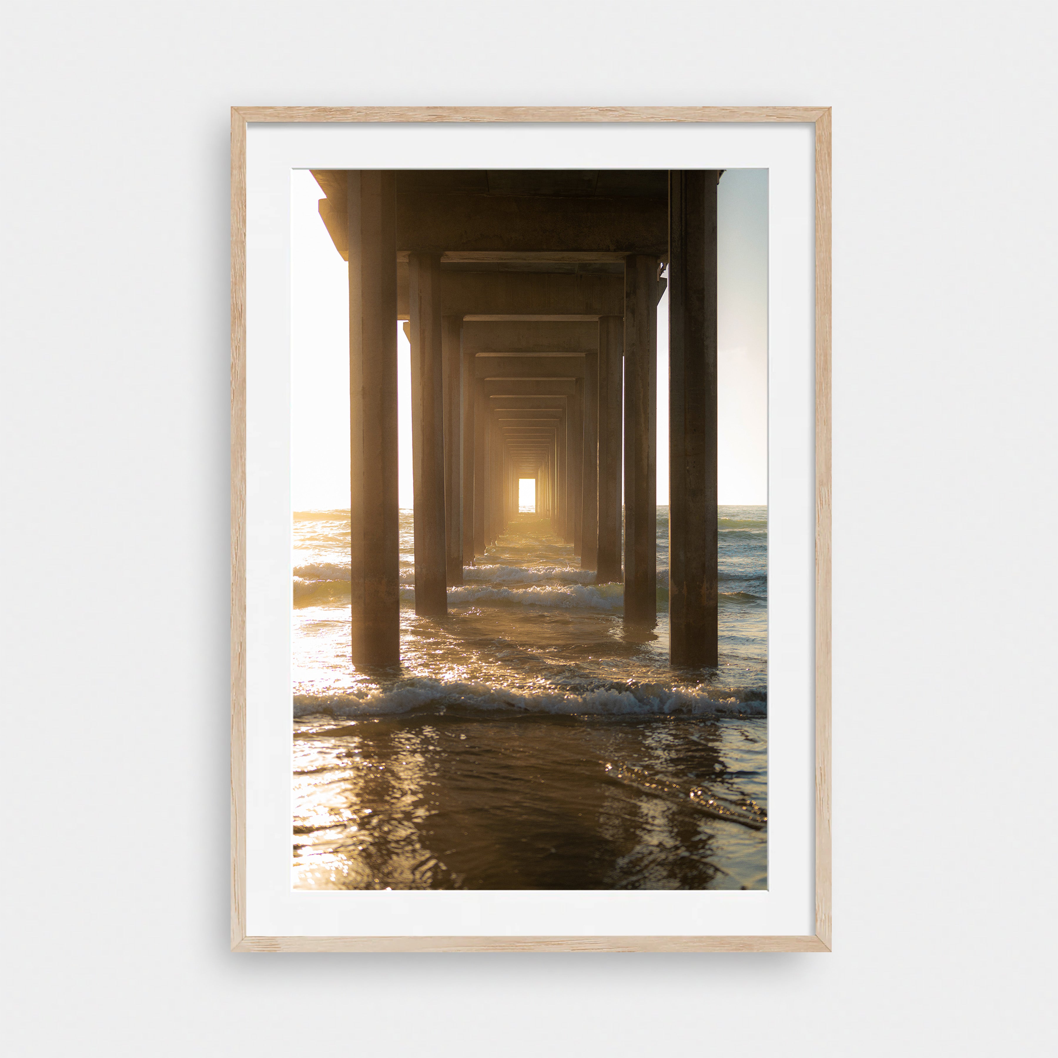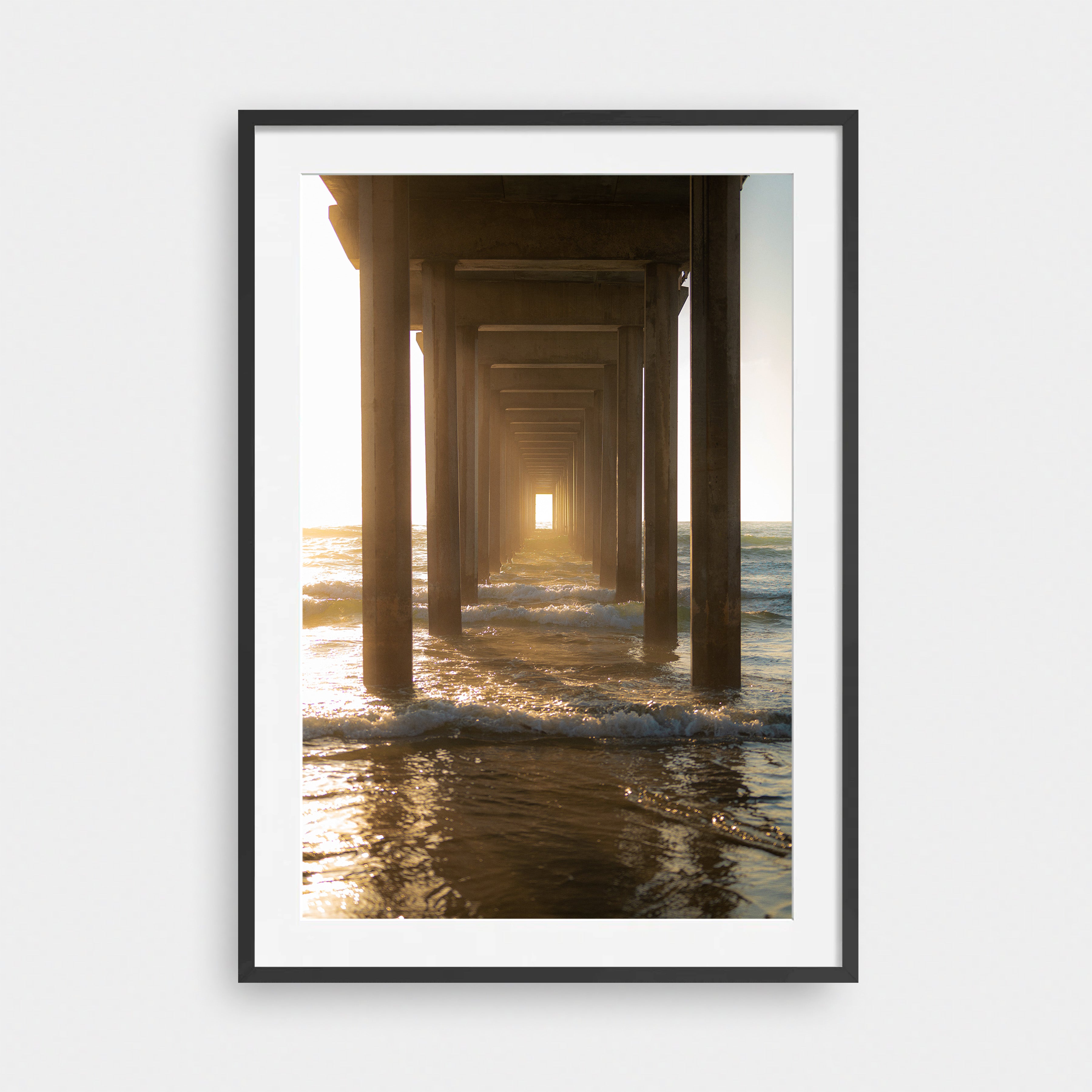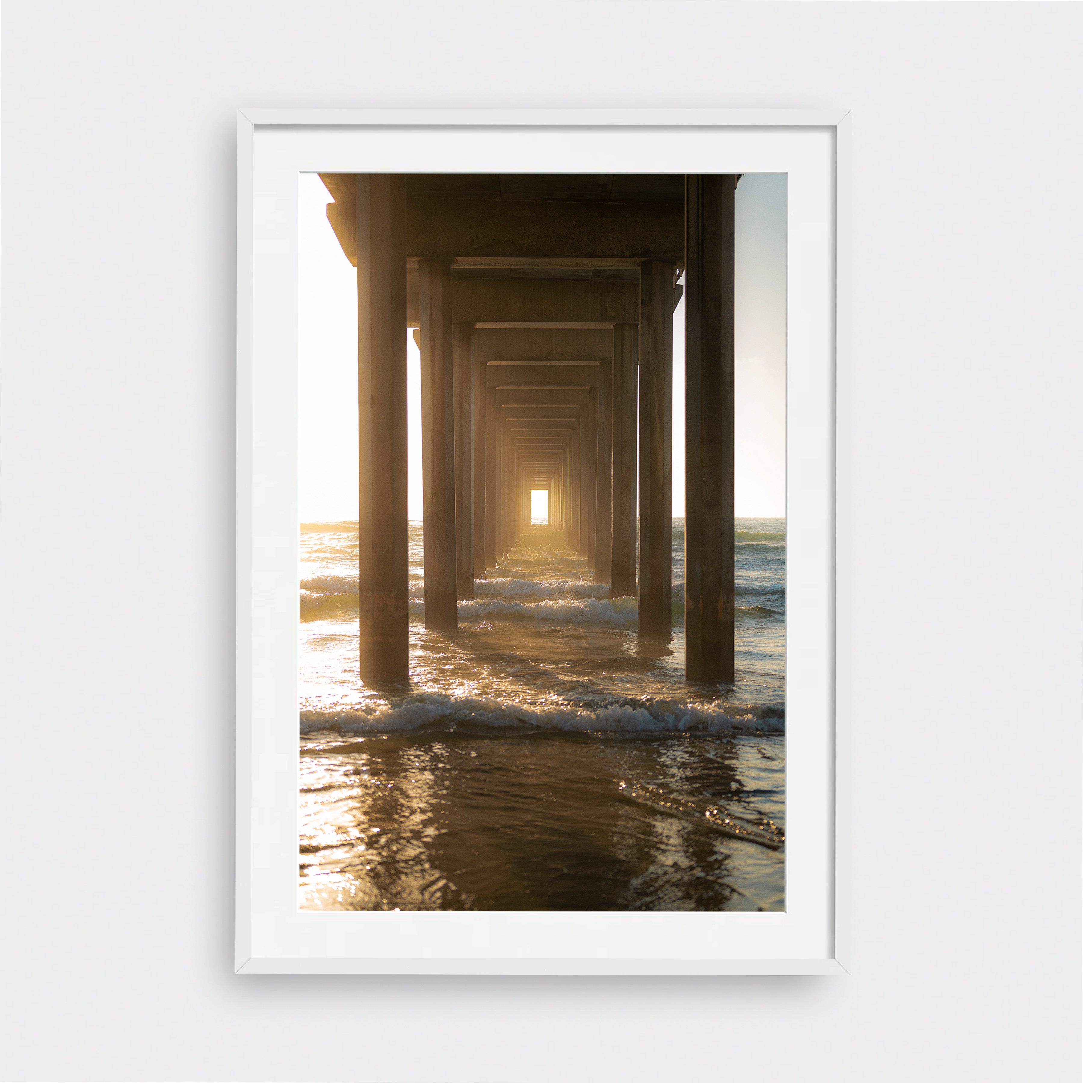 Through the Pier draws the viewer into a quiet, almost meditative passage beneath the structure itself. Repeating columns create a strong sense of symmetry and depth, pulling the eye toward a glowing opening of light at the horizon. Waves roll steadily through the frame, catching warm reflections as the sun filters in from the side.