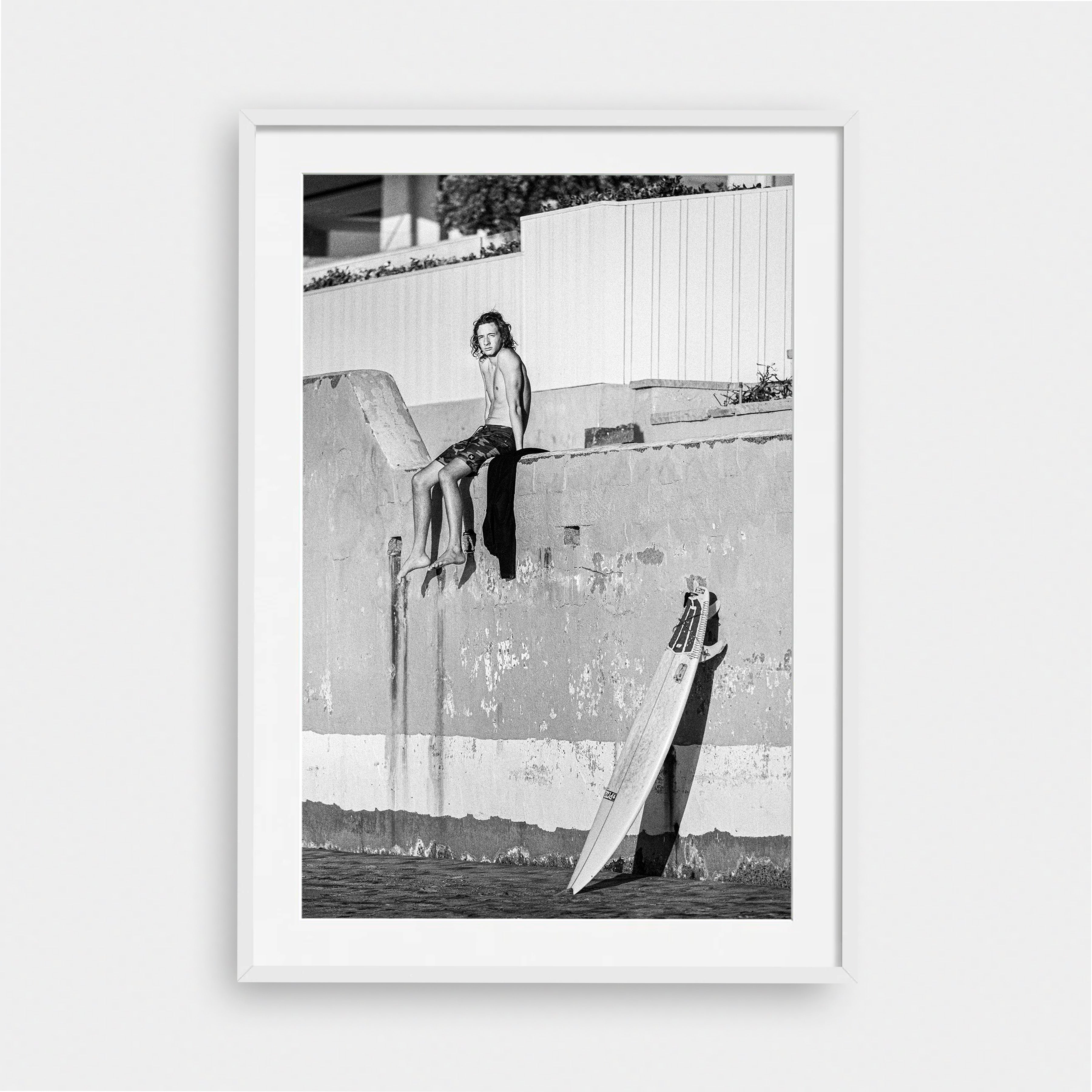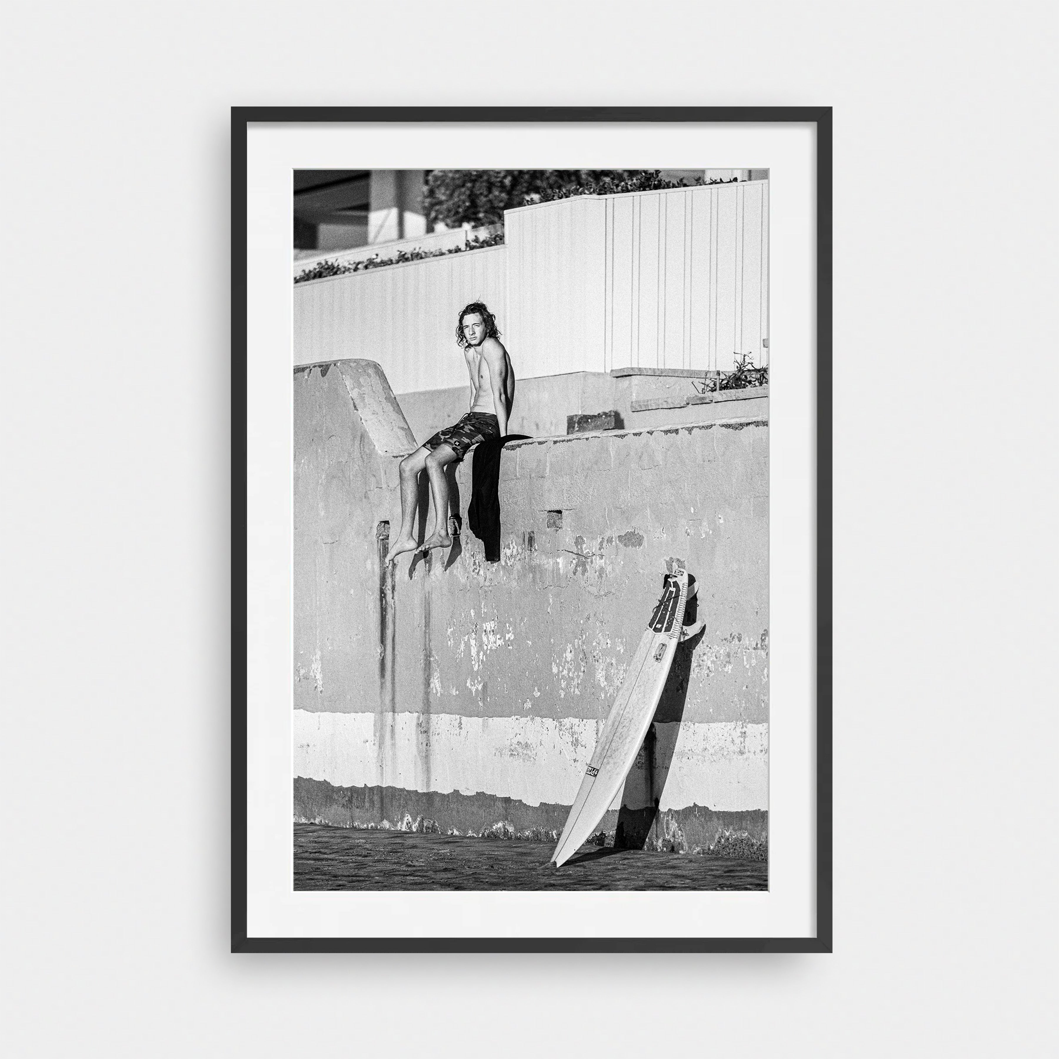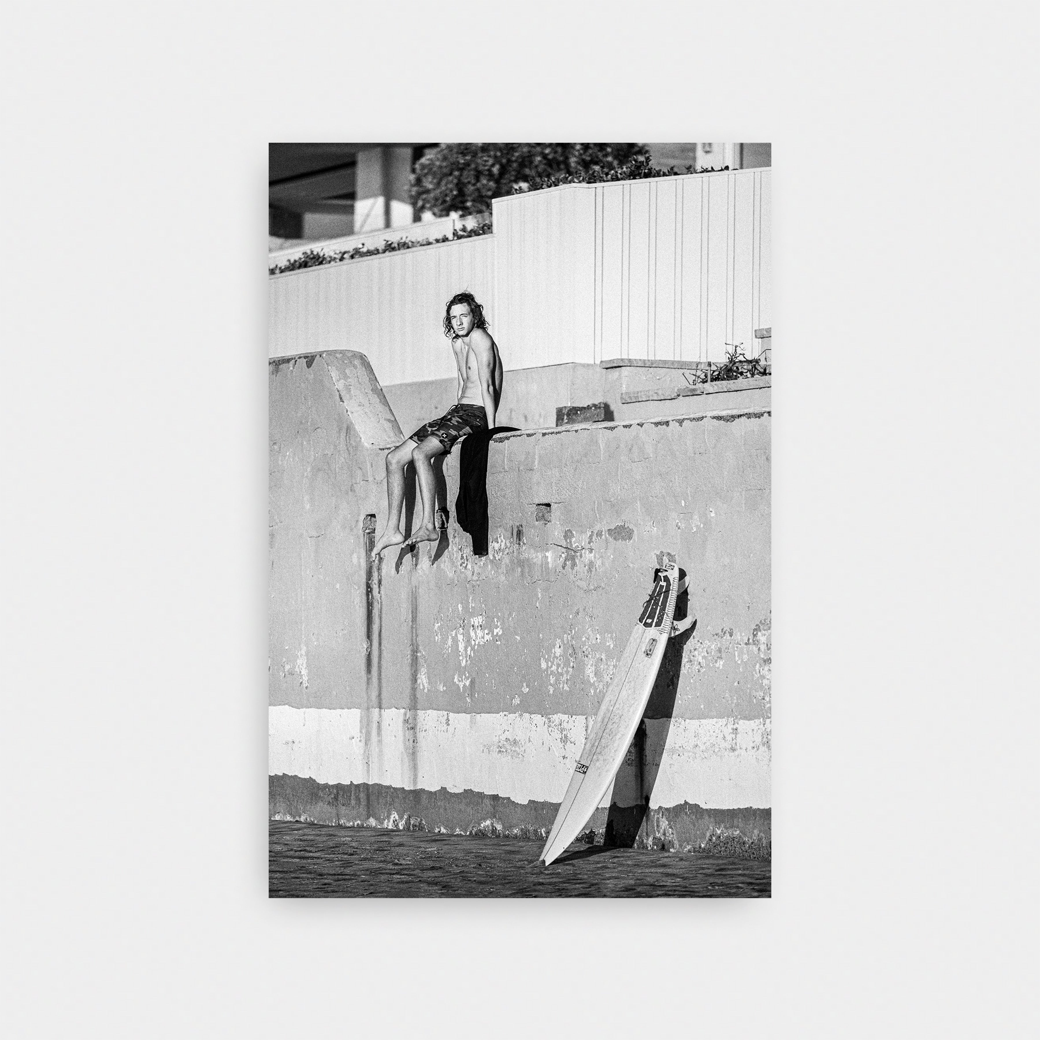 Wave Hang captures a quiet, unguarded moment between sets. Shot in black and white, the image freezes a pause in time—a surfer perched above the water, feet dangling over a weathered seawall, board resting below. The textures of concrete, skin, and salt-stained fiberglass carry as much weight as the subject itself.