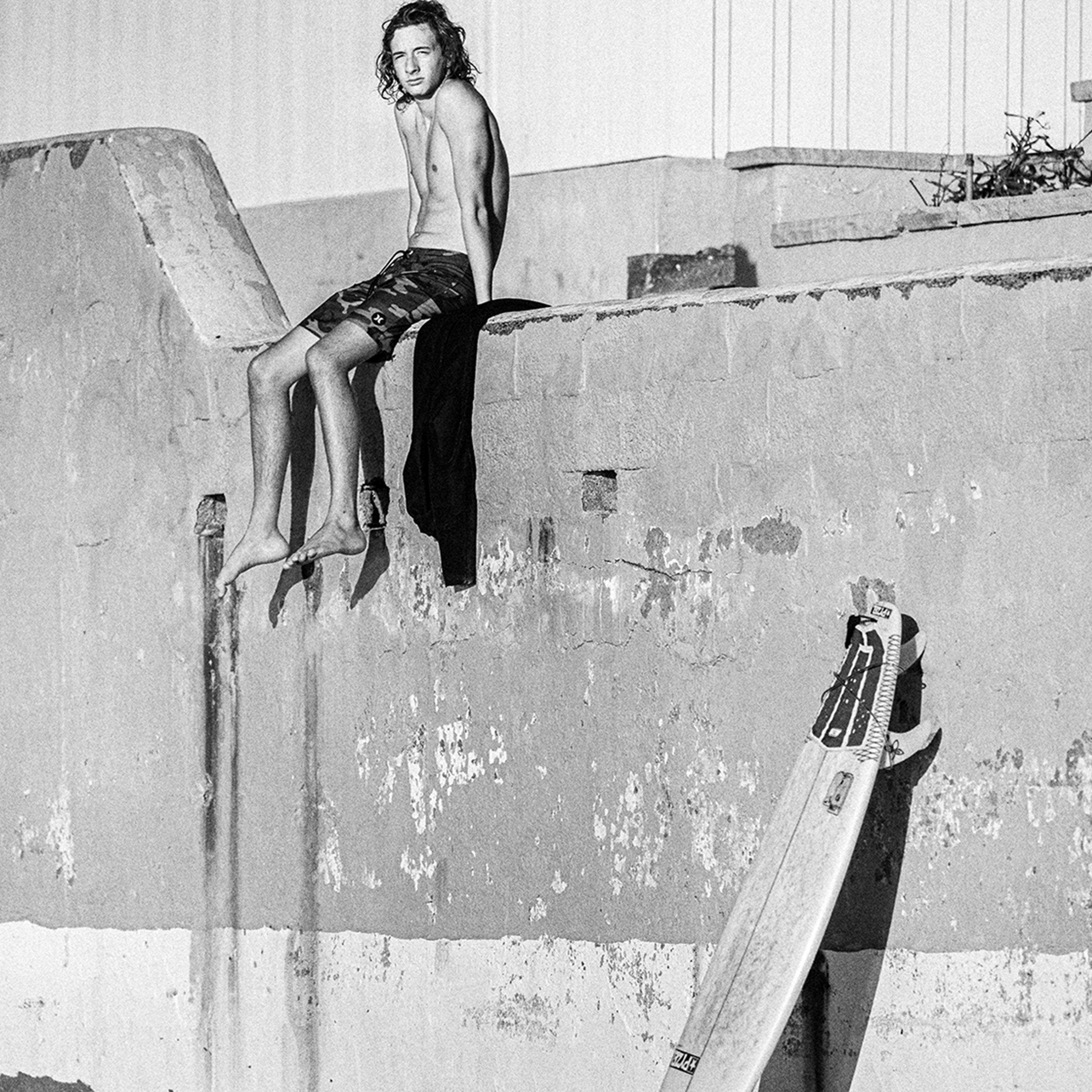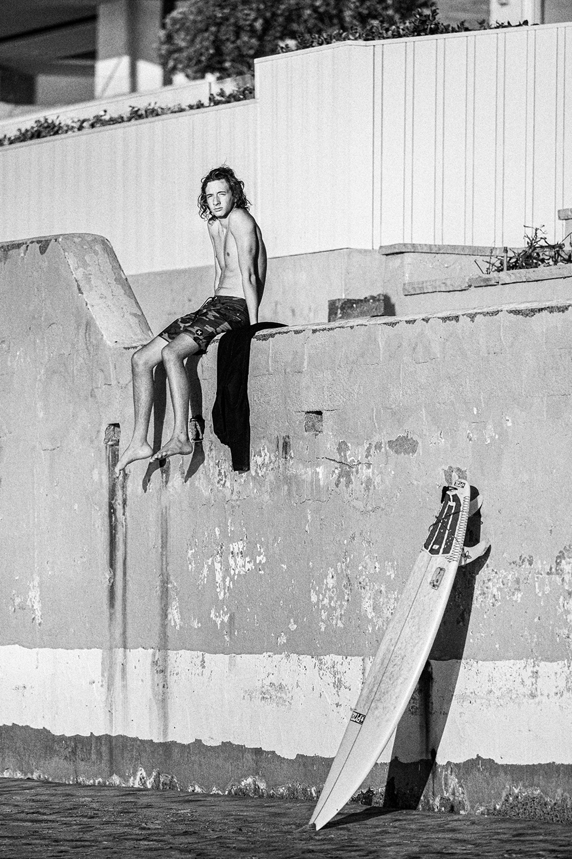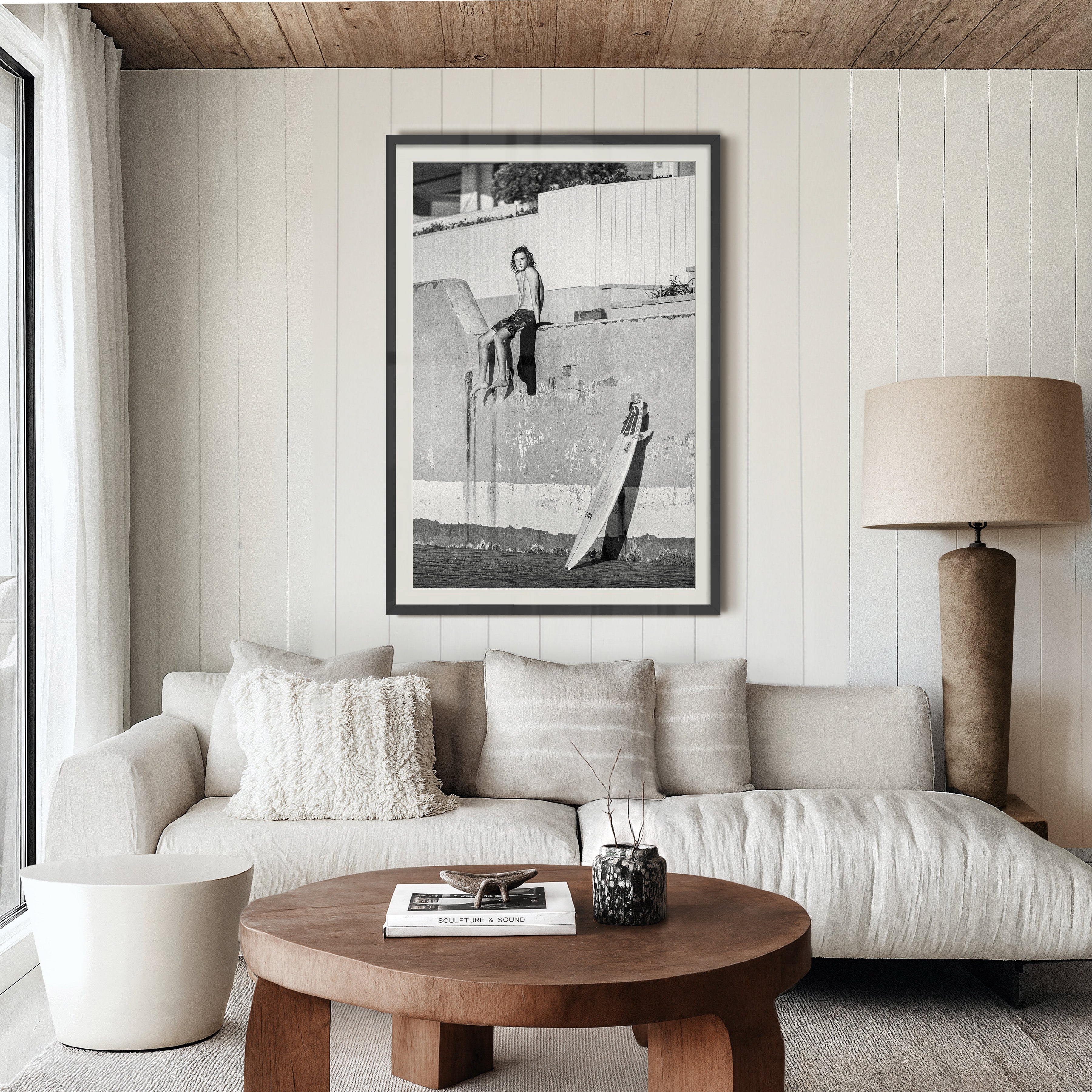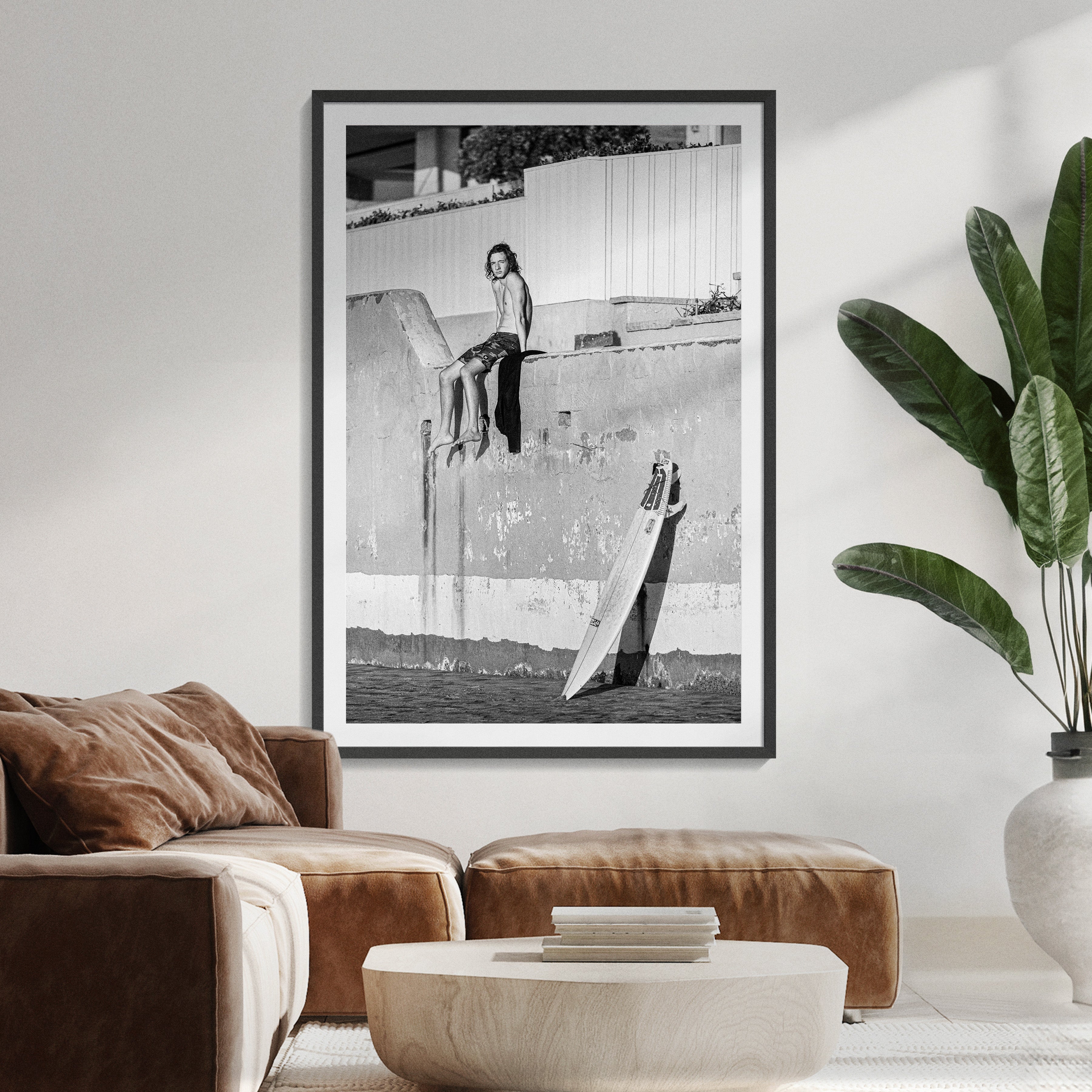 Wave Hang captures a quiet, unguarded moment between sets. Shot in black and white, the image freezes a pause in time—a surfer perched above the water, feet dangling over a weathered seawall, board resting below. The textures of concrete, skin, and salt-stained fiberglass carry as much weight as the subject itself.